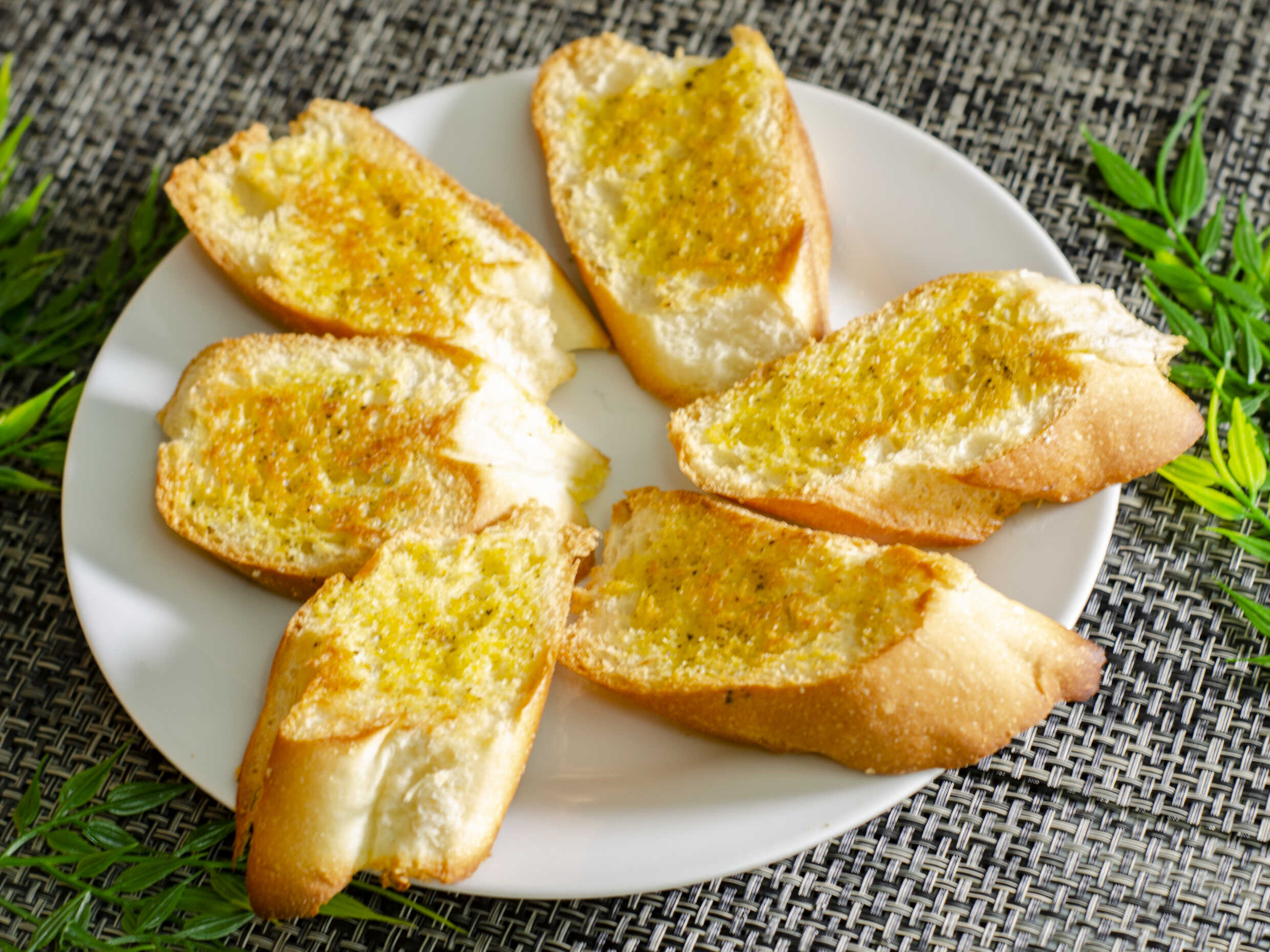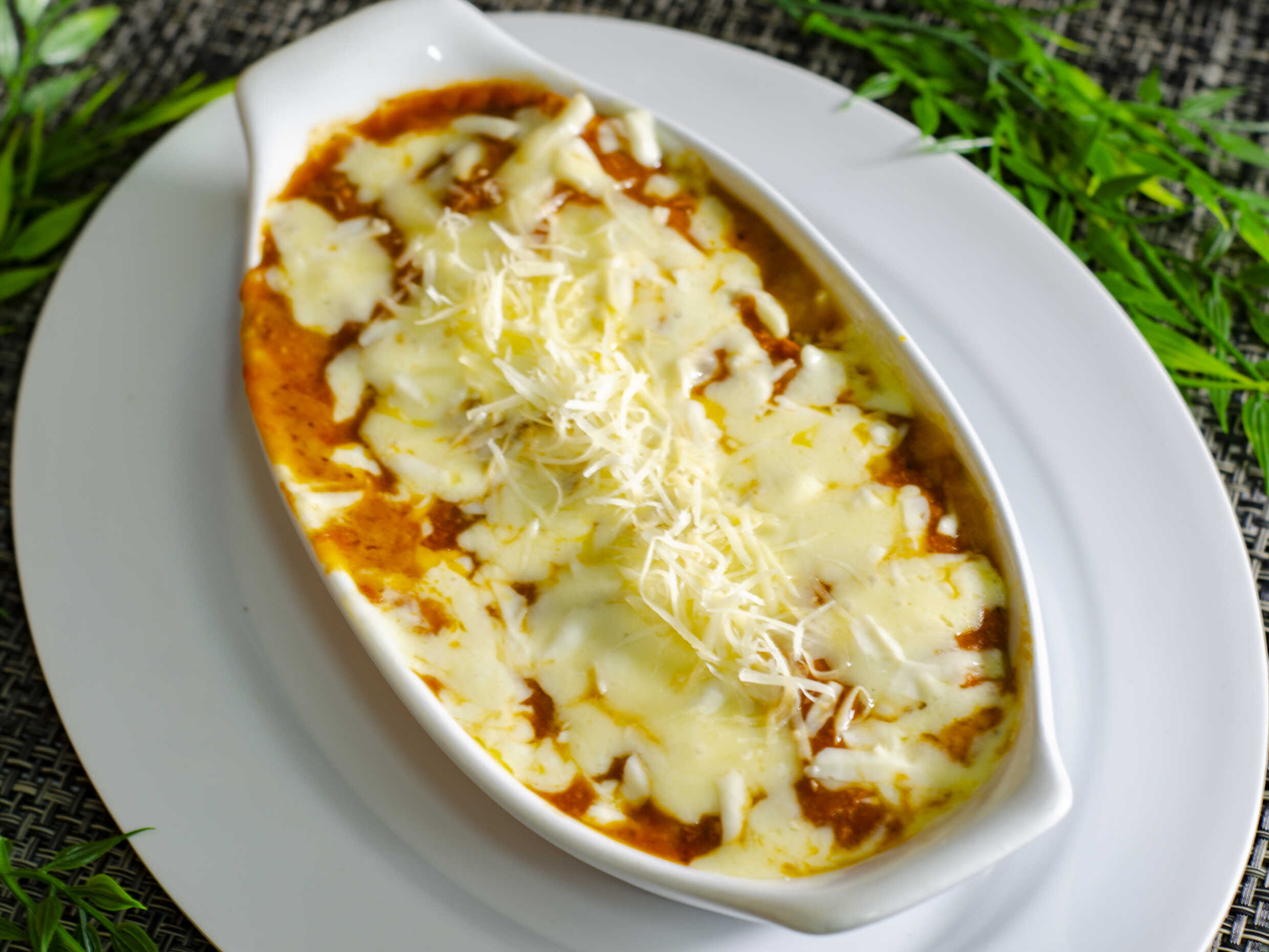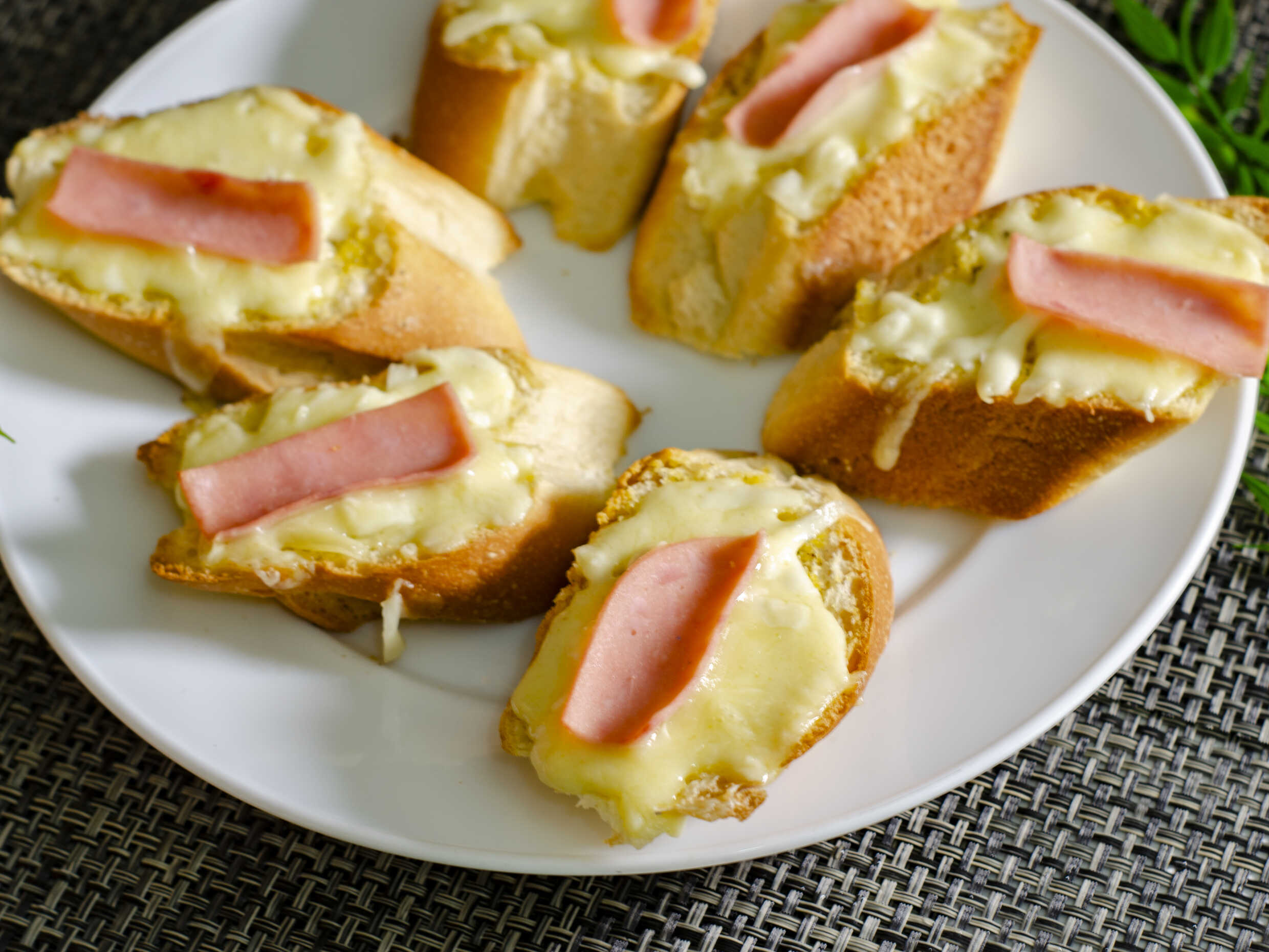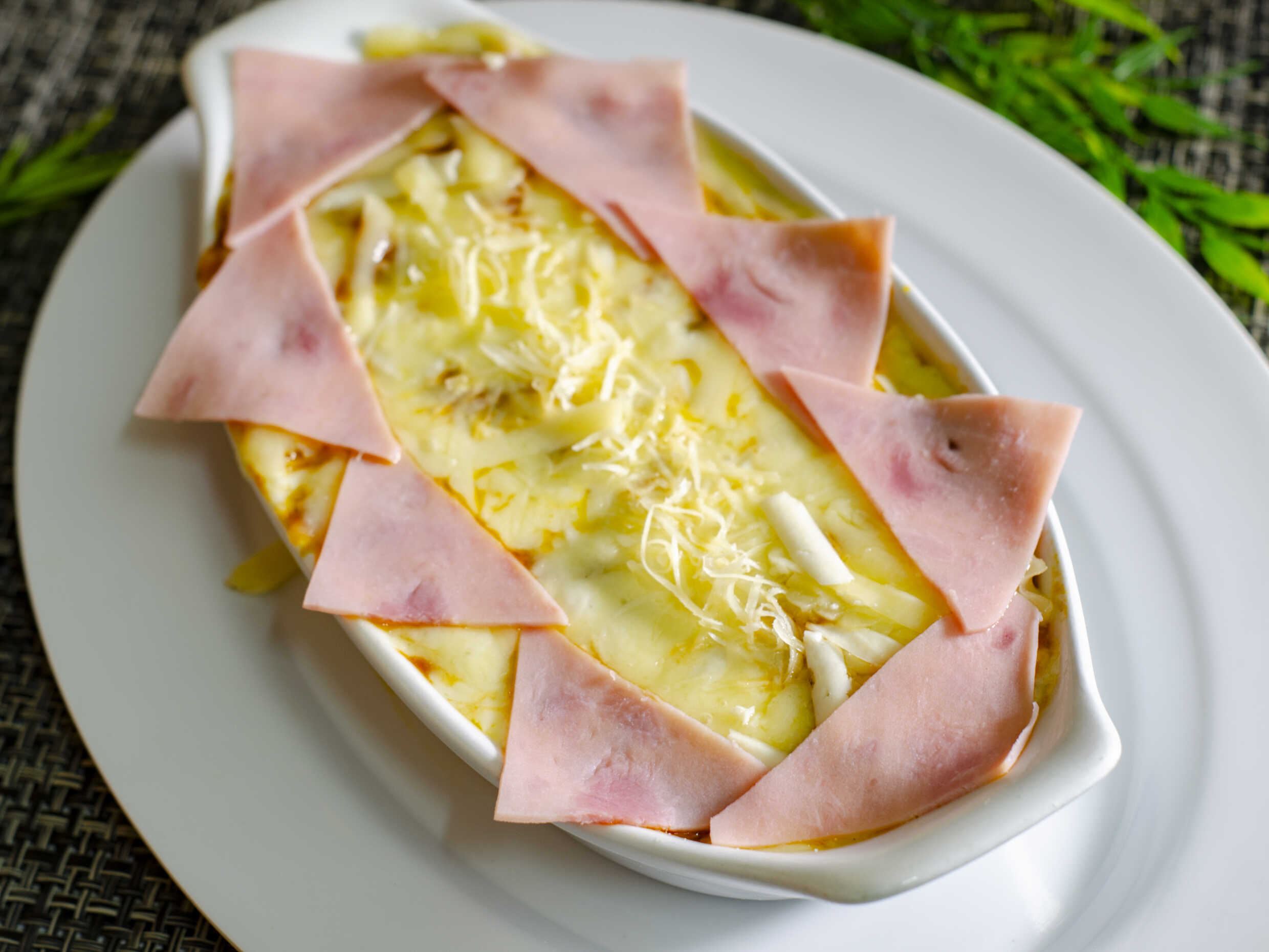 salsa blanca, jamón y queso acompañado de 3 uds de pan al ajo.