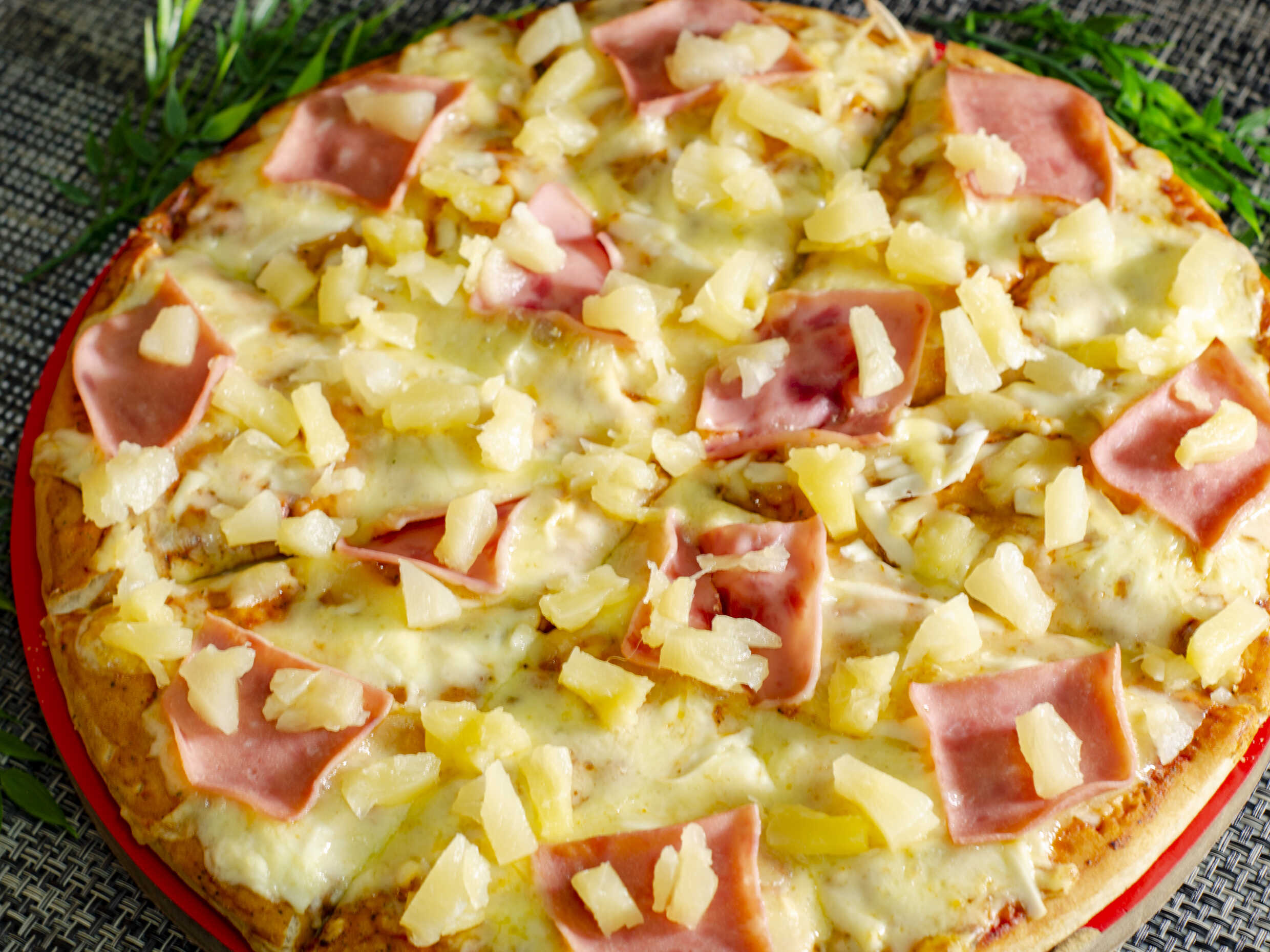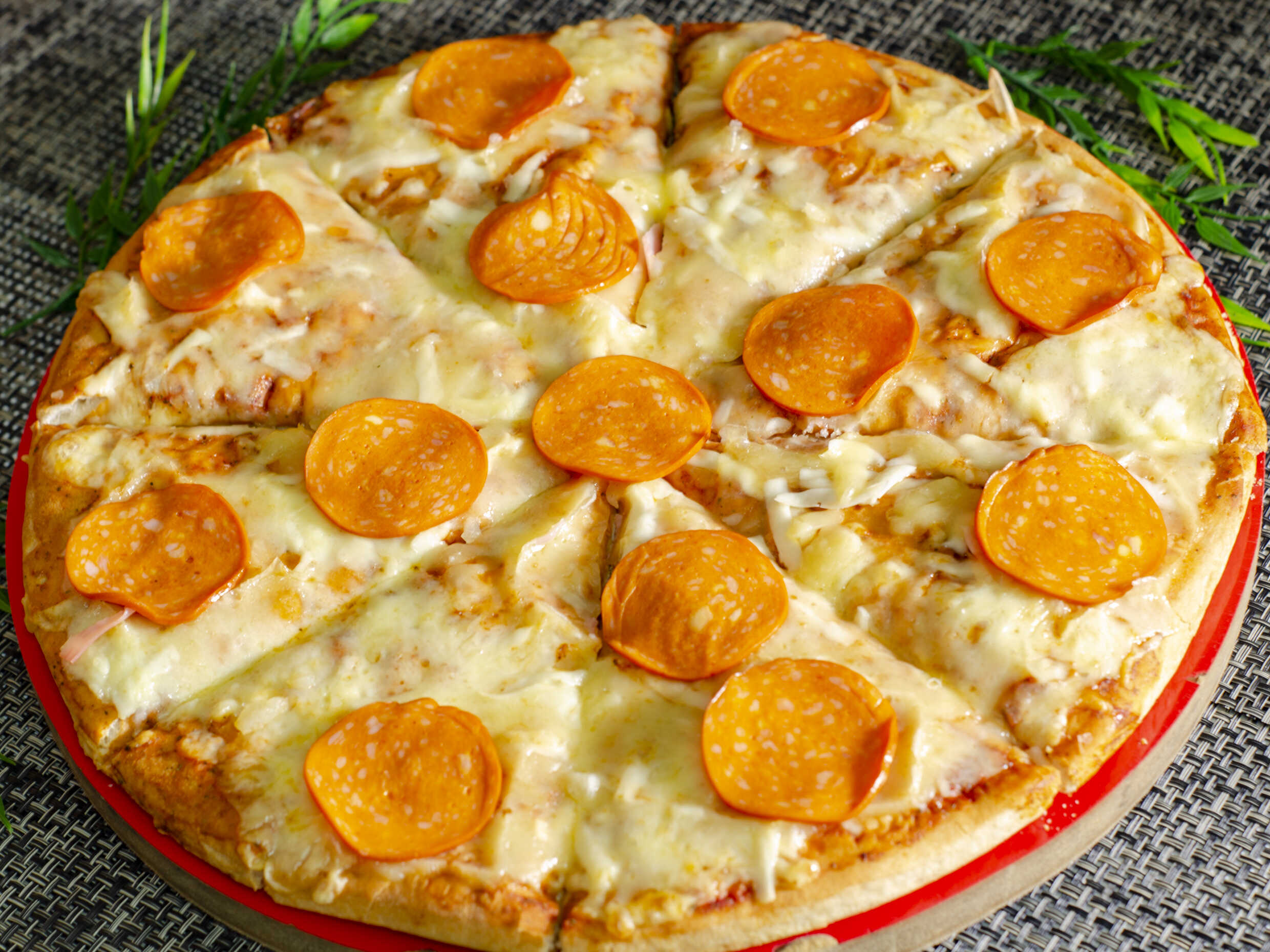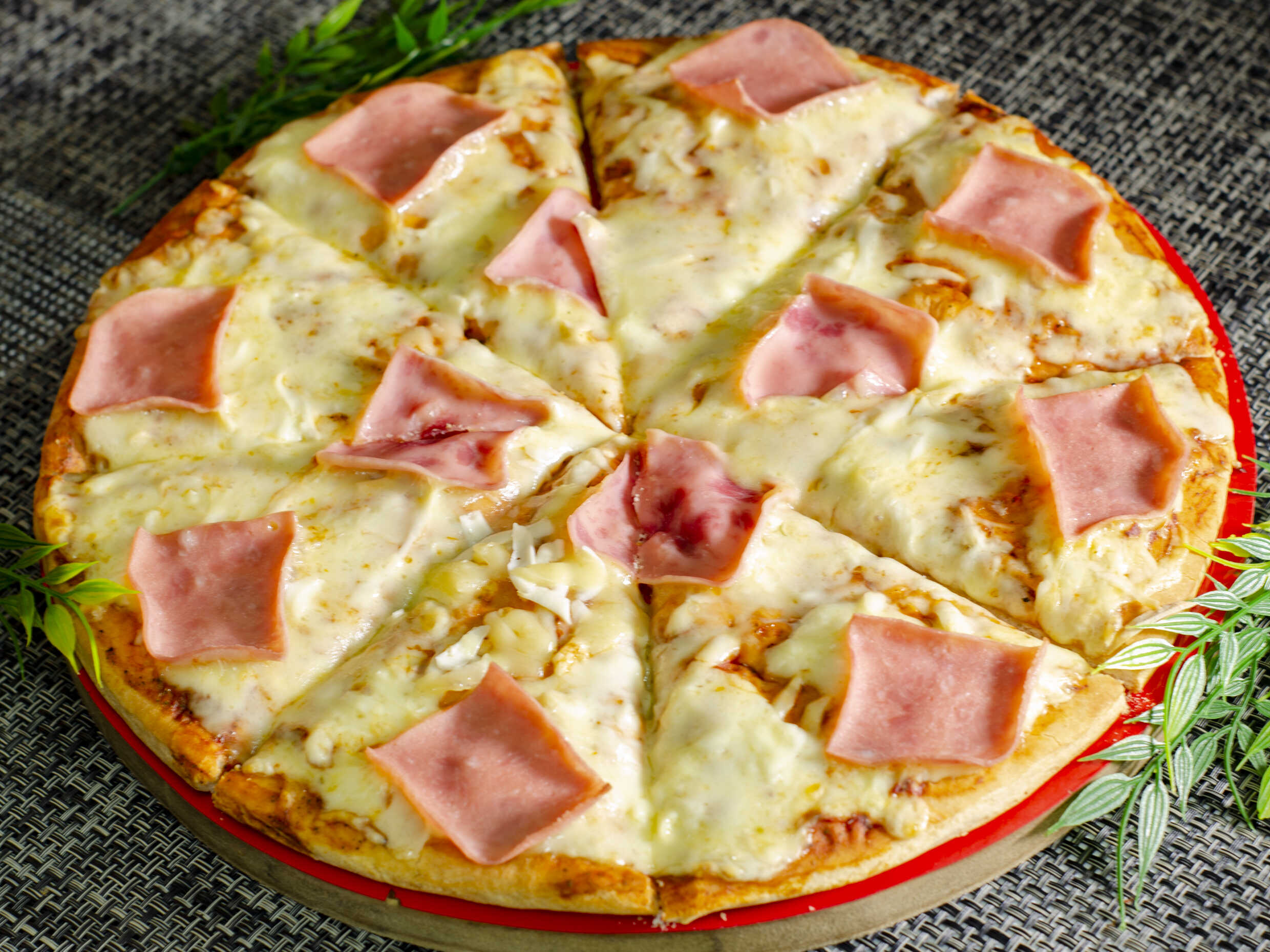 Queso mozzarella, jamón, salame, pepperoni, hot dog, chorizo , champiñones, aceituna y cebolla blanca.