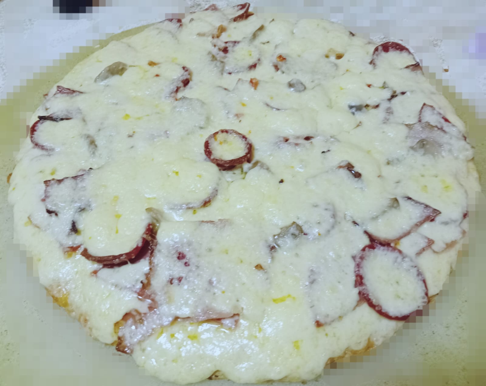 Ingredientes: salsa pizzera, queso mozzarella, salame, pimientos y aceitunas.