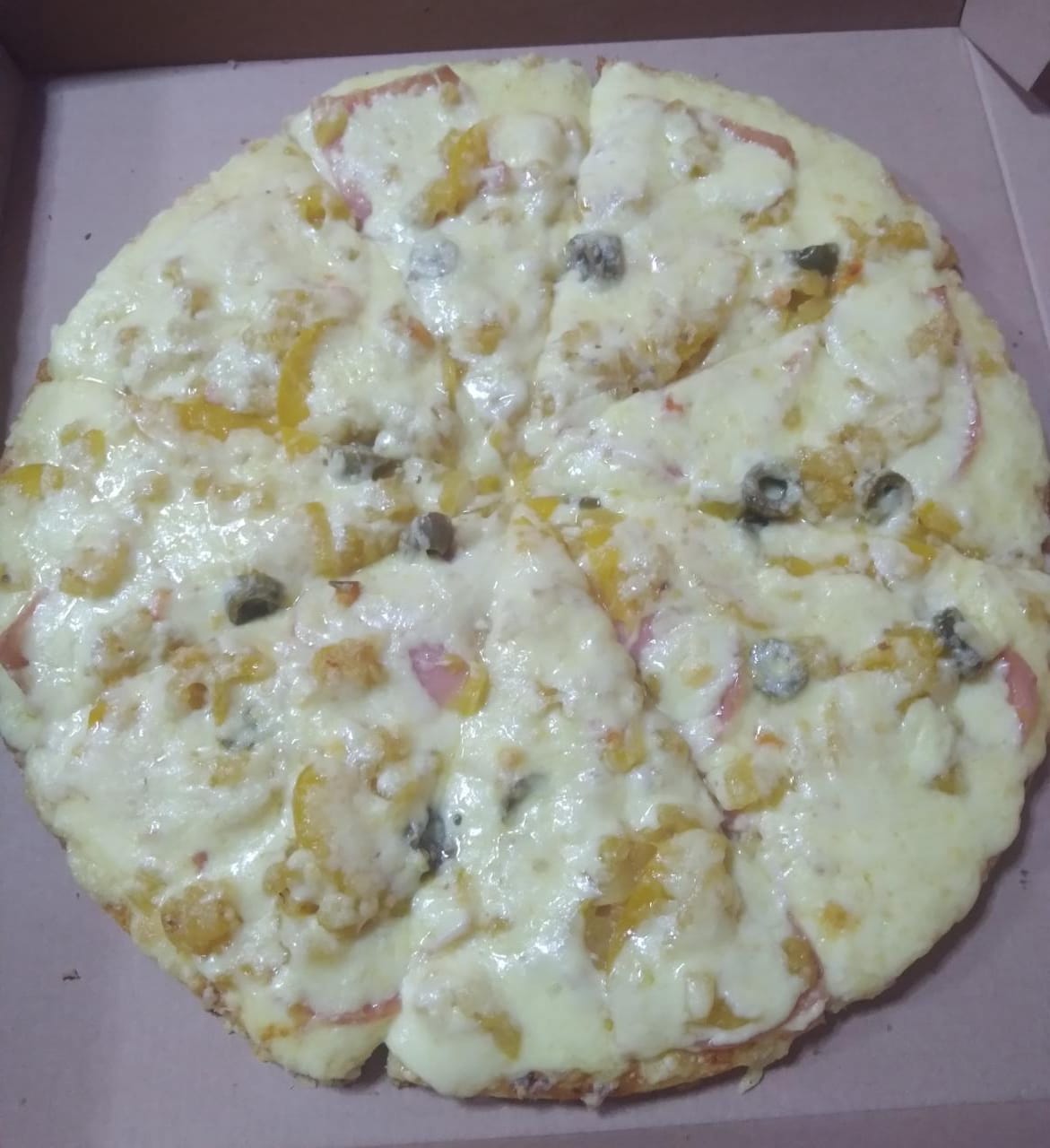 Ingredientes: salsa pizzera, queso mozzarella, jamón, piña, durazno, doble queso, pimientos y aceitunas.