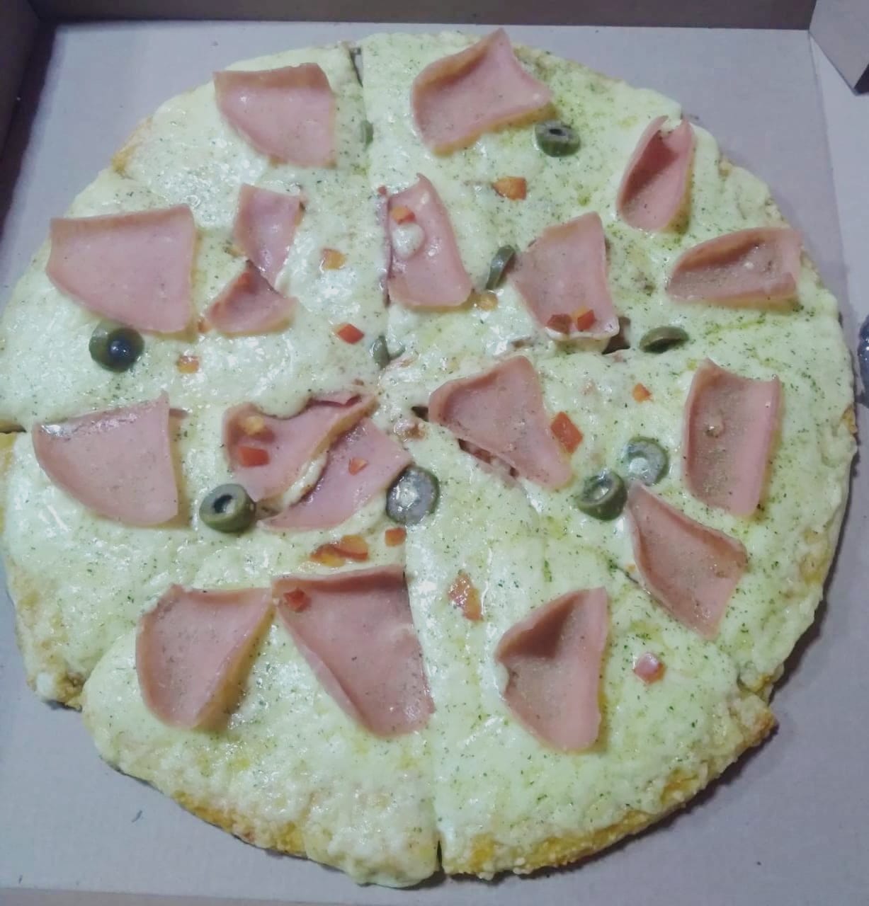 Ingredientes: salsa pizzera, queso mozzarella, jamón, pimientos y aceituna.