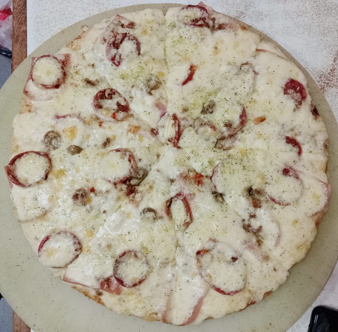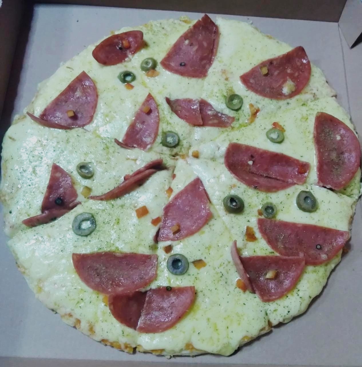 Ingredientes: salsa pizzera, queso mozzarella, chorizo, carne, doble queso, jamón, pimientos y aceitunas.