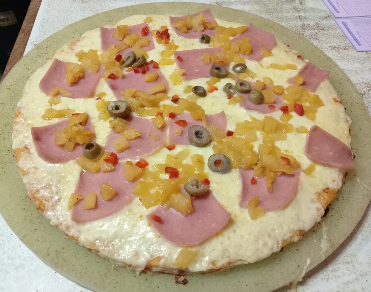 Ingredientes: salsa pizzera, queso mozzarella, jamón, piña, pimientos y aceitunas.