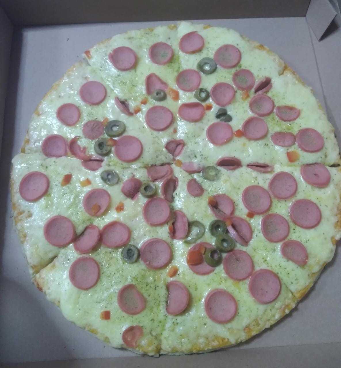 Ingredientes: salsa pizzera, queso mozzarella, hot dog, pimientos y aceitunas.
