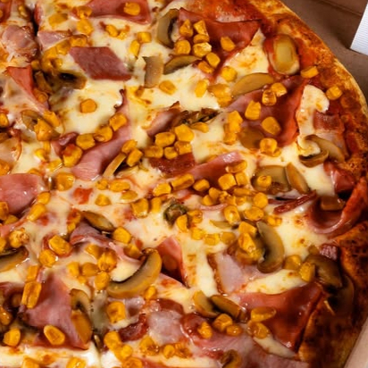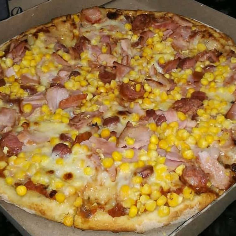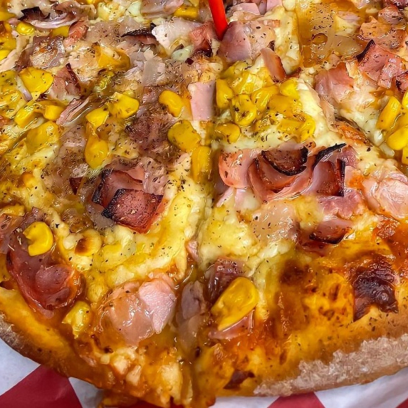 masa Artesanal, Salsa Pomodoro, Mozzarella, Jamón, Tocino y Maíz americano