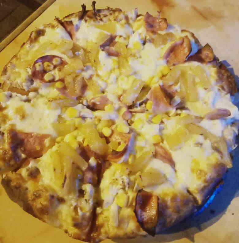 Salsa, mozzarella, jamón, tocino, maíz y piña.