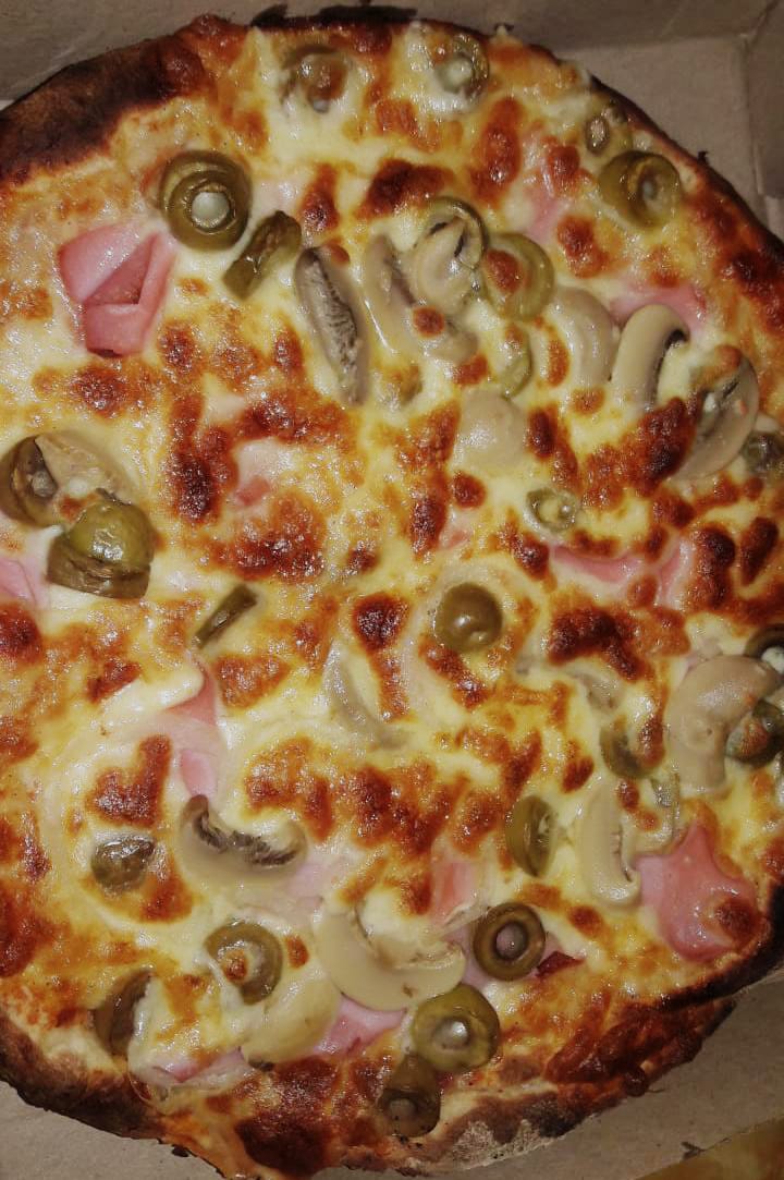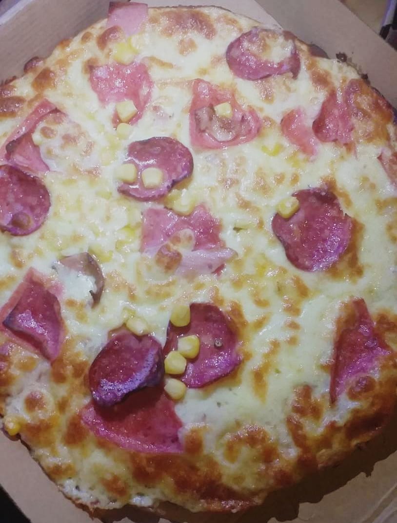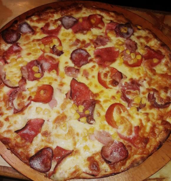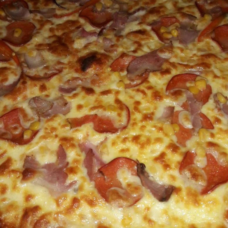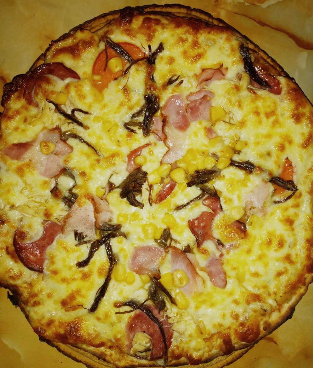 Salsa, mozzarella, jamón, champiñón, pimentón, cebolla y maíz.