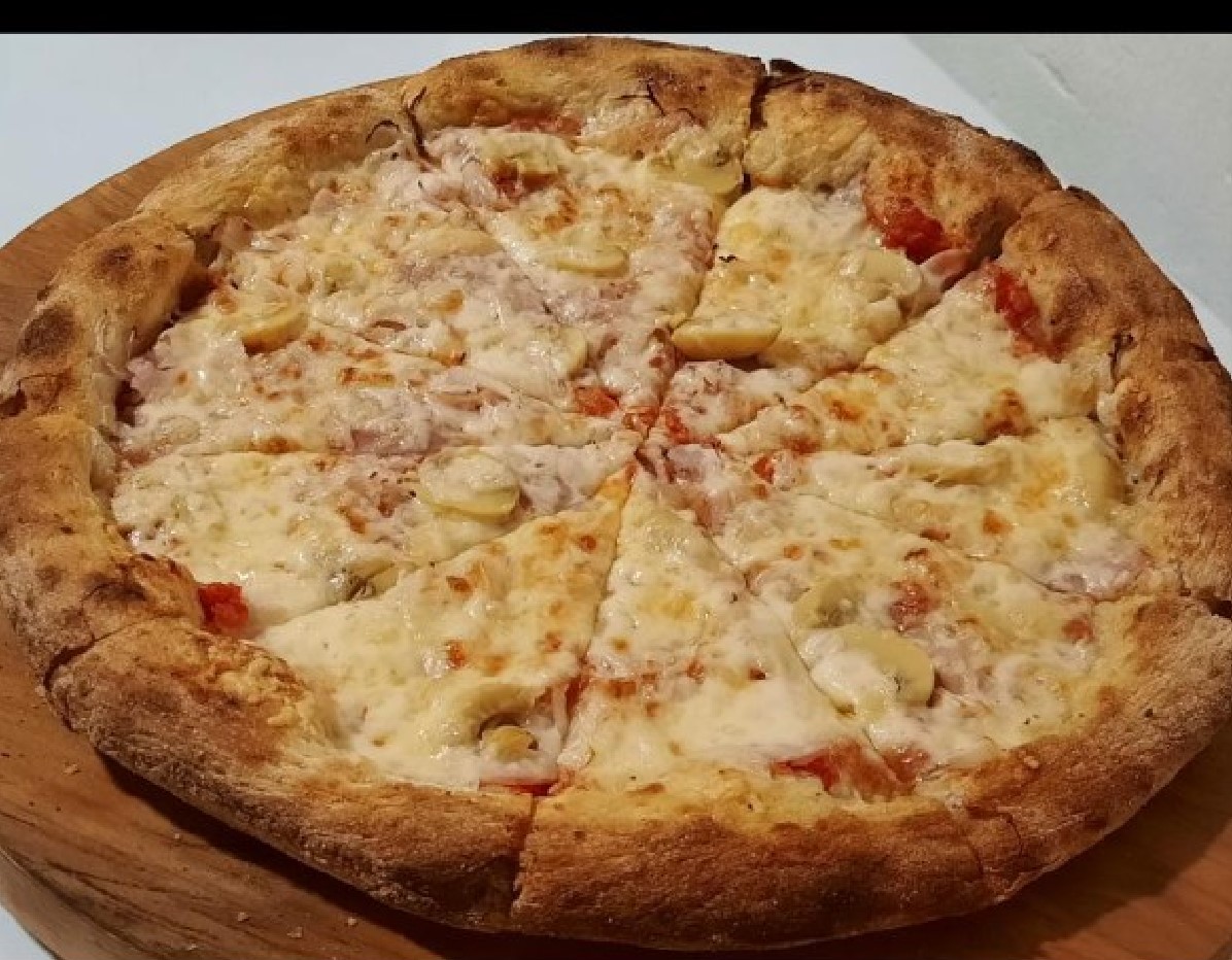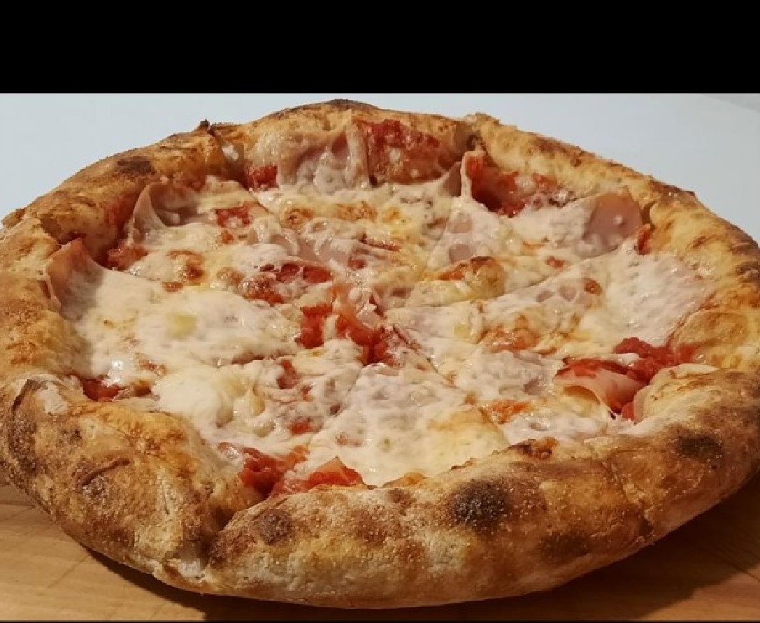 Pizza americana de 8 porciones con Salsa de tomate, queso mozzarella y jamón.