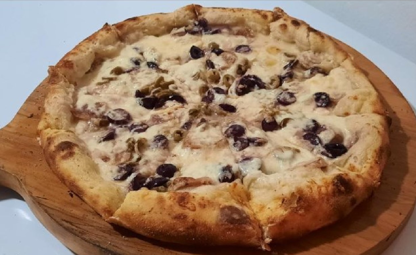Pizza Española de 8 porciones con queso mozzarella, chorizo, cebolla blanca, aceitunas verdes, aceitunas negras, y salsa de ajo de fondo.