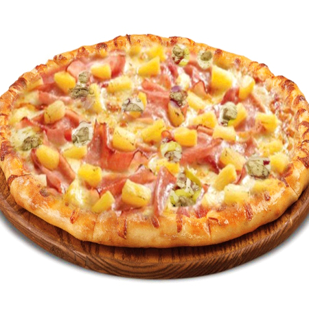 Pizza de masa artesanal de 21 cm. Ingredientes: jamón, piña, pollo parrillero y mozzarella.