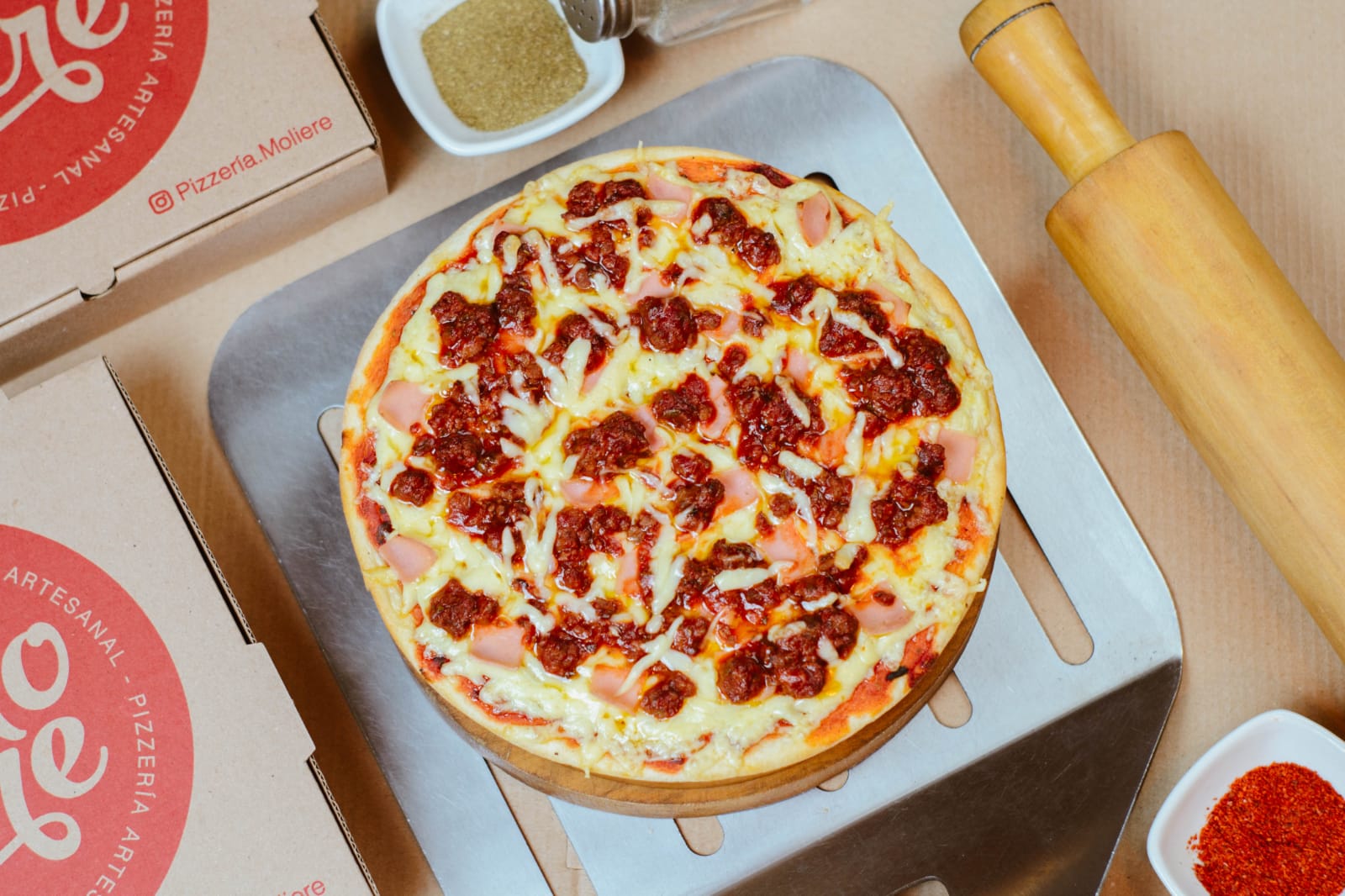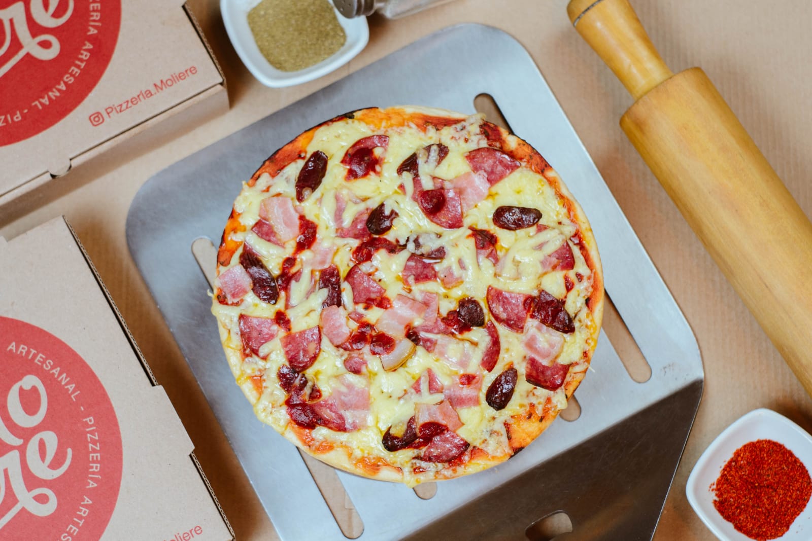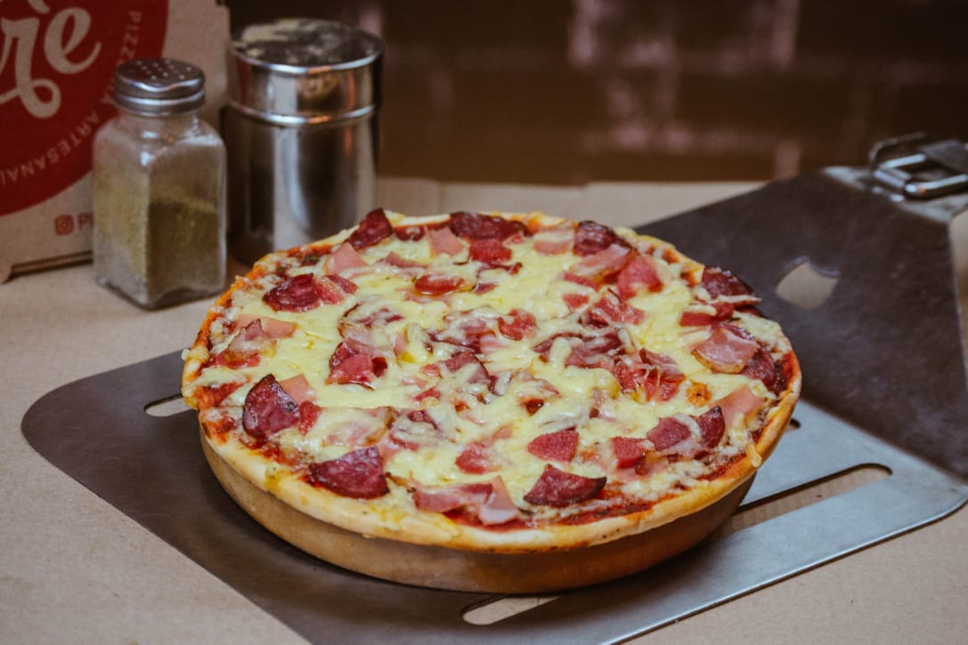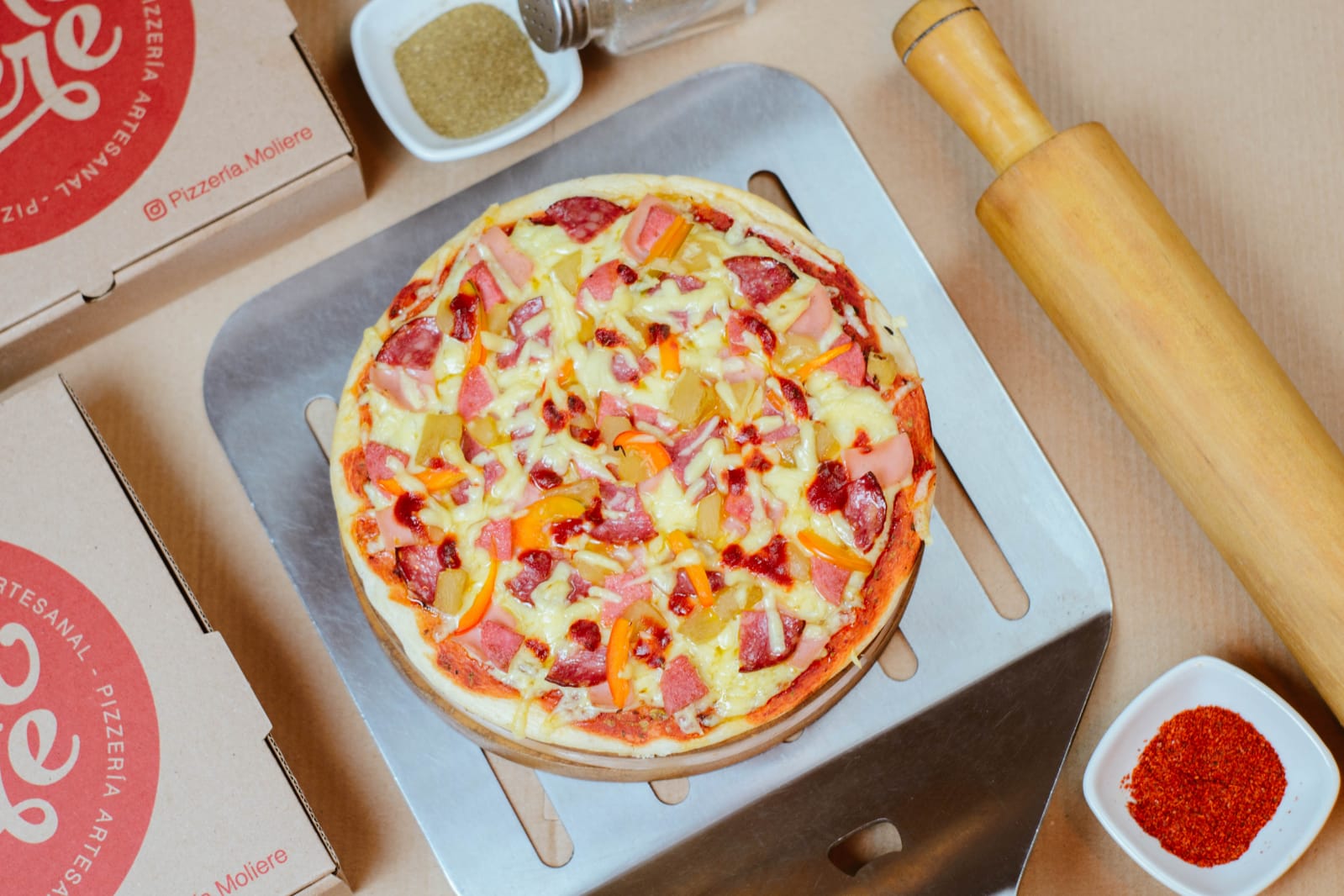 Pimiento, jamón, salame, piña, chorizo y queso.