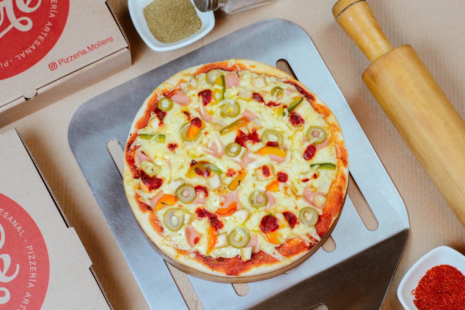 Pollo, jamón, aceitunas, pimiento y queso.
