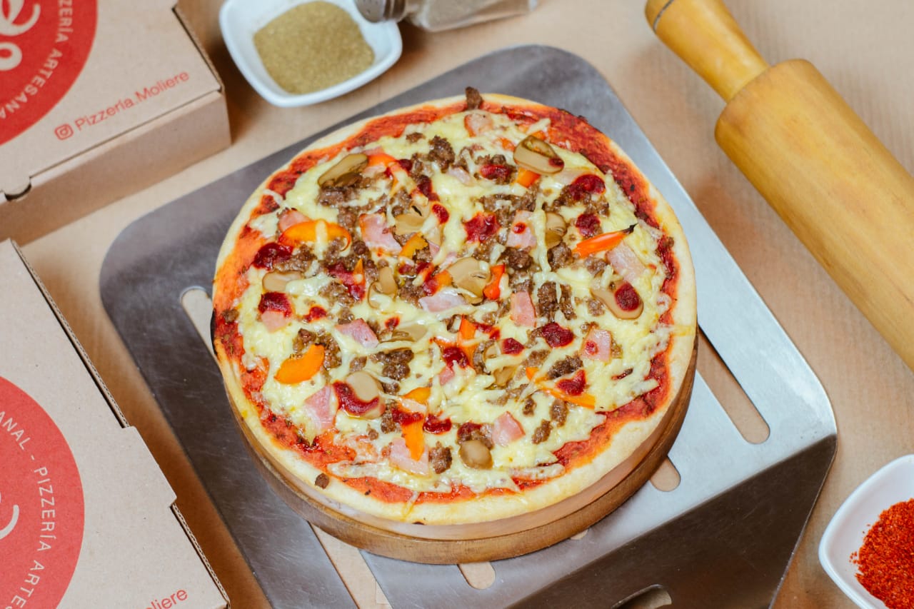 Jamón, tocino, peperoni, chorizo y queso.
