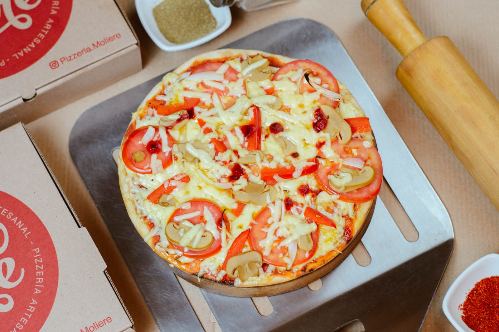 Tomate, pimiento, champiñones, cebolla y queso.