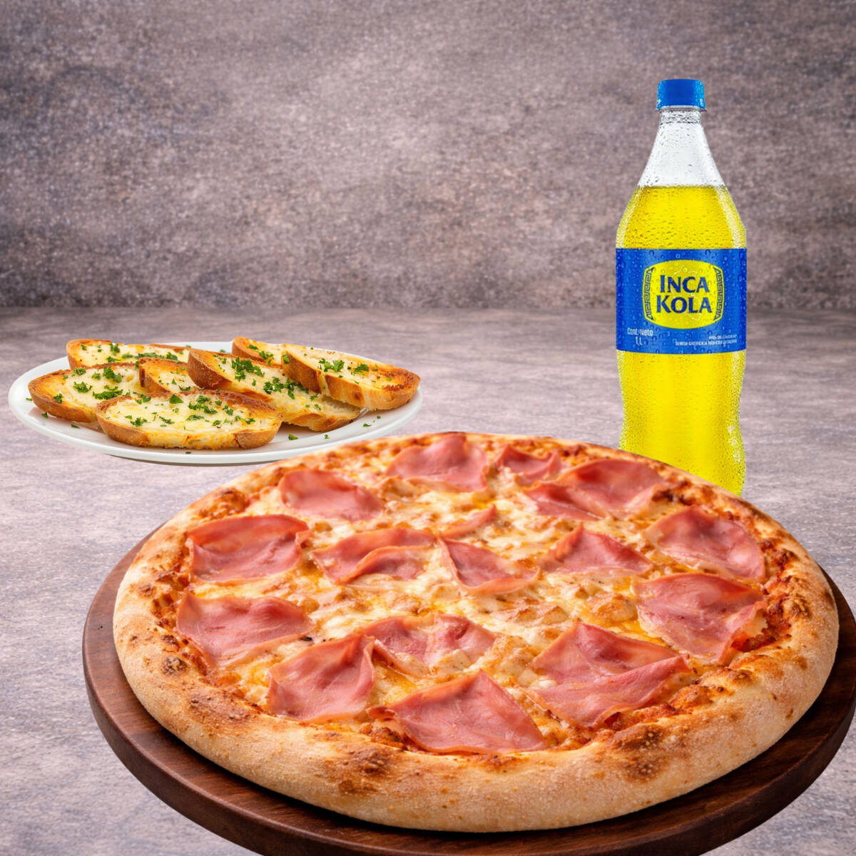 Pizza familiar de 10 porciones (35cm) sabor a elección, pan al ajo y una Inca Kola de litro.
