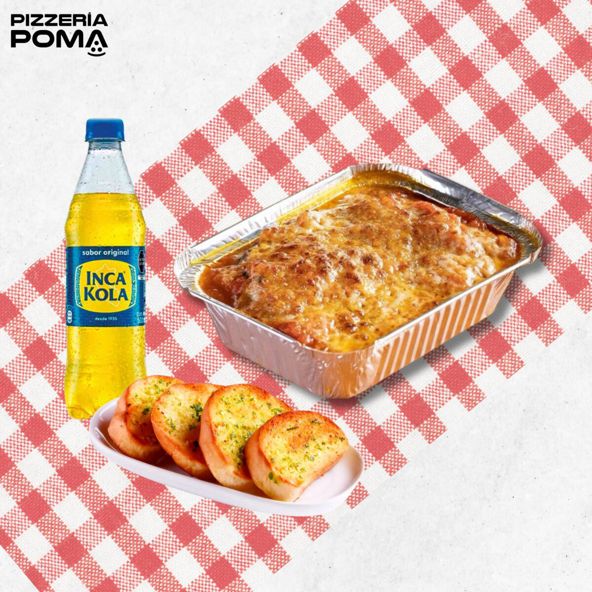 Lasaña de 750 gramos, inca cola o coca cola personal y pan al ajo.