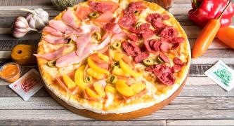 Mozzarella, jamón, piña, durazno, salame, chorizo, cabanossi, tocino ahumado, lomo.
