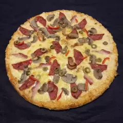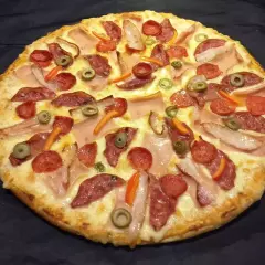 Mozzarella, jamón, salame, chorizo y tocino ahumado.