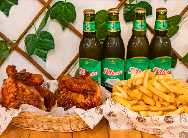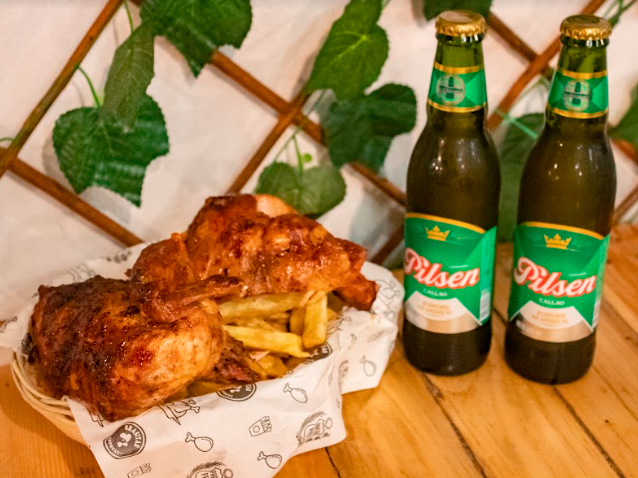 Incluye 1 pollo a la brasa hecho a leña y carbón, papas, cremas y 4 cervezas Pilsen 305 ml.
