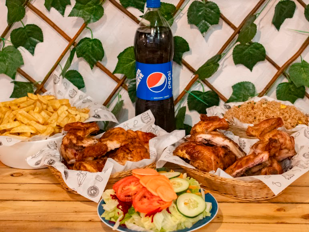 Incluye 2 pollos a la brasa hecho a leña y carbón, papas, chaufa, ensalada, una Pepsi 1,5 L y cremas.