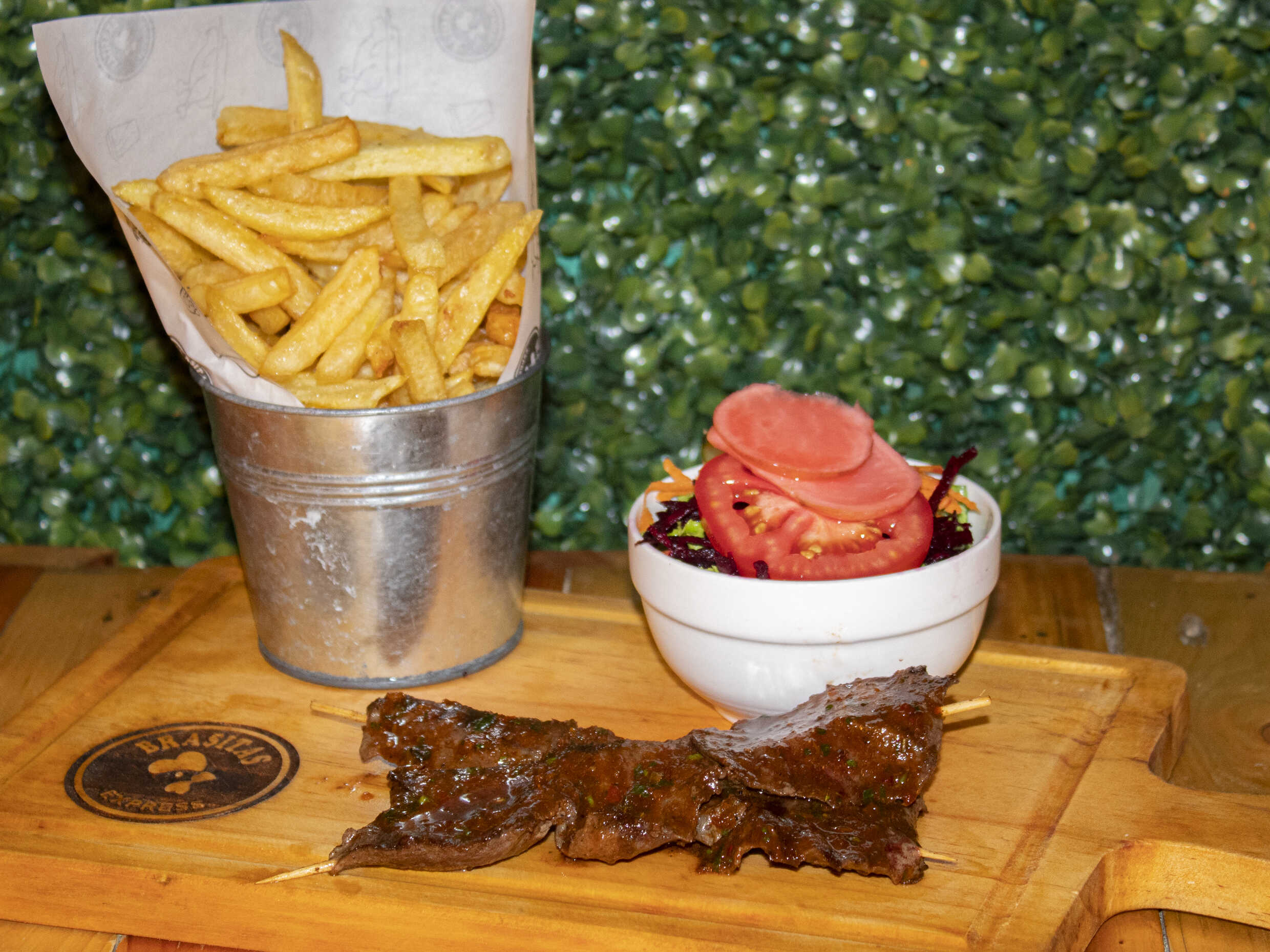 Incluye churrasco 200 g, papas fritas, ensalada y cremas.