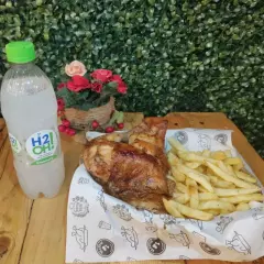 1/2 pollo brasa Brasitas más papas a la francesa.