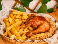 Incluye 1/4 de pollo a la brasa hecho a leña y carbón, papas, cremas y ensalada.