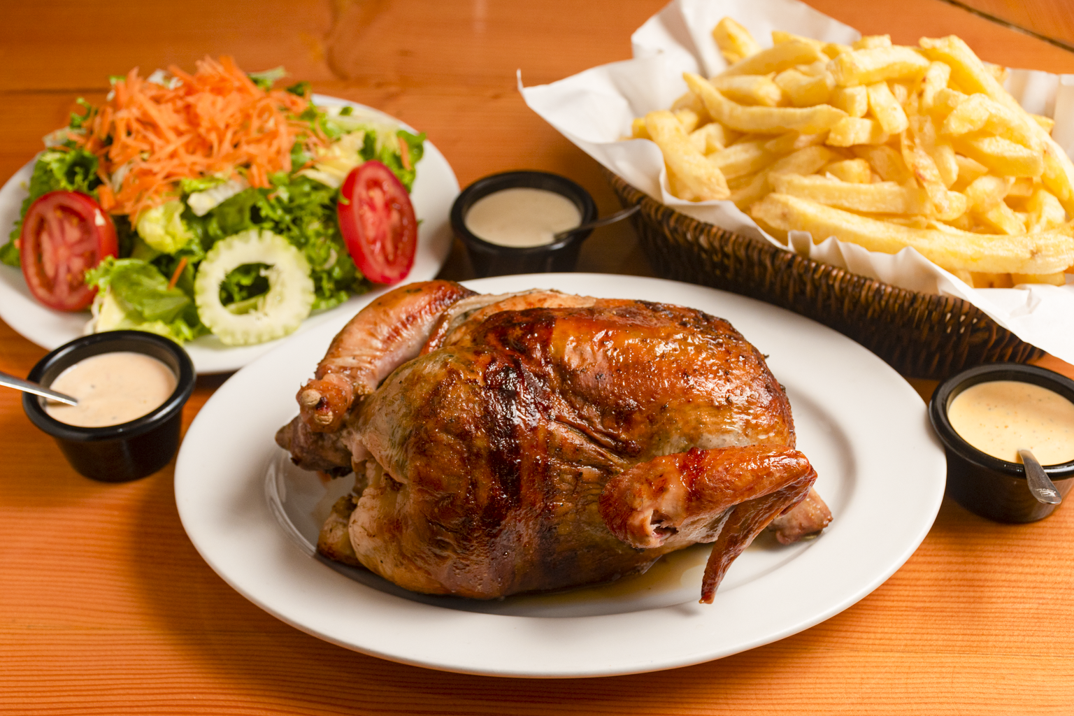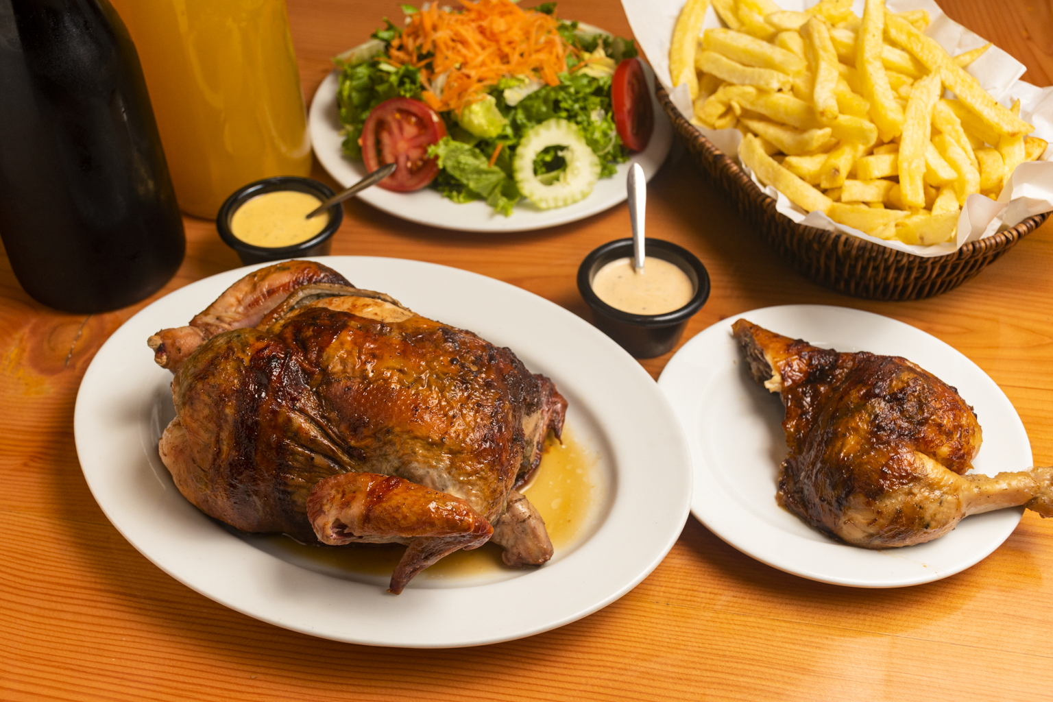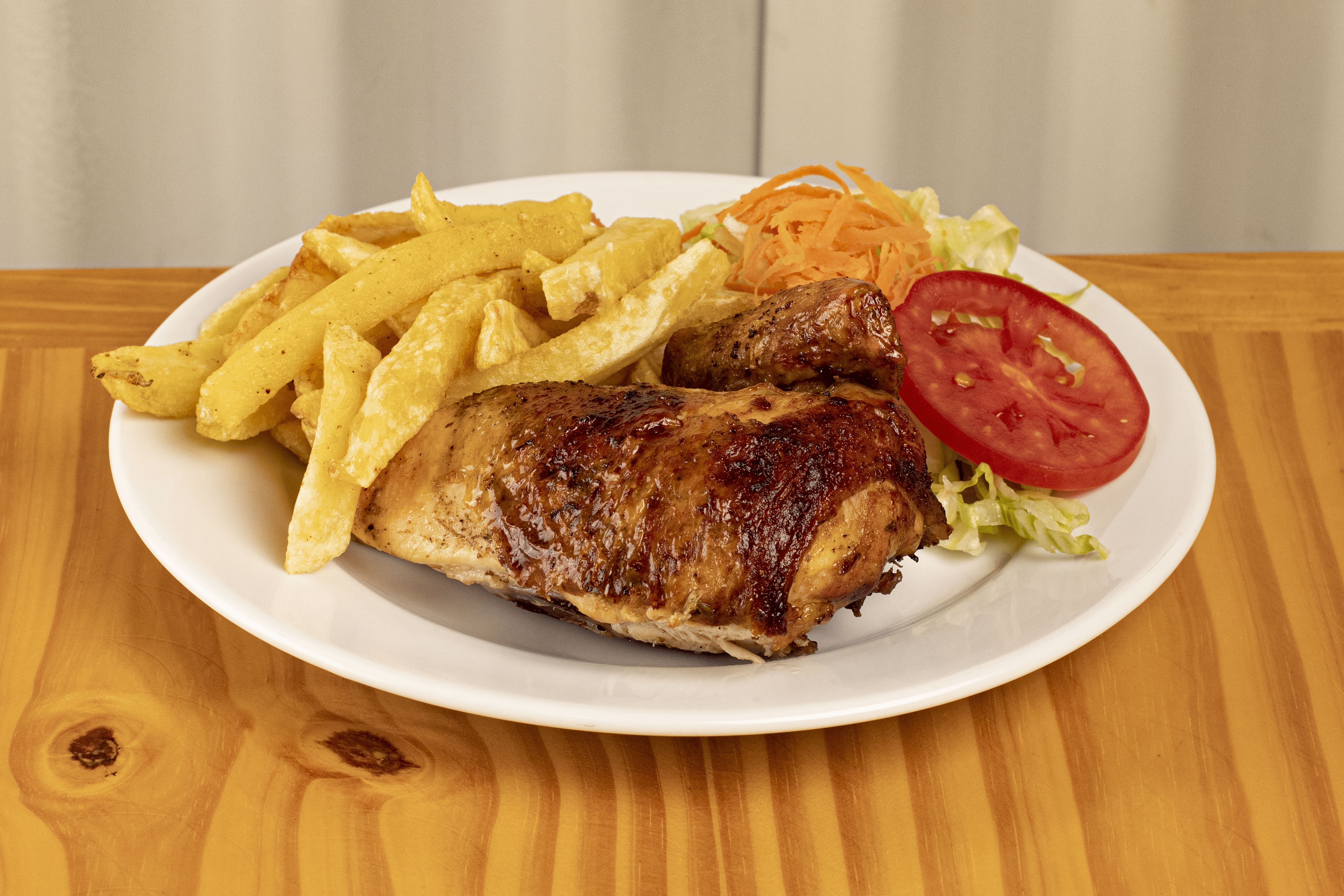 Jugoso medio pollo acompañado de papas fritas, ensalada casera y nuestras exquisitas salsas de la casa.