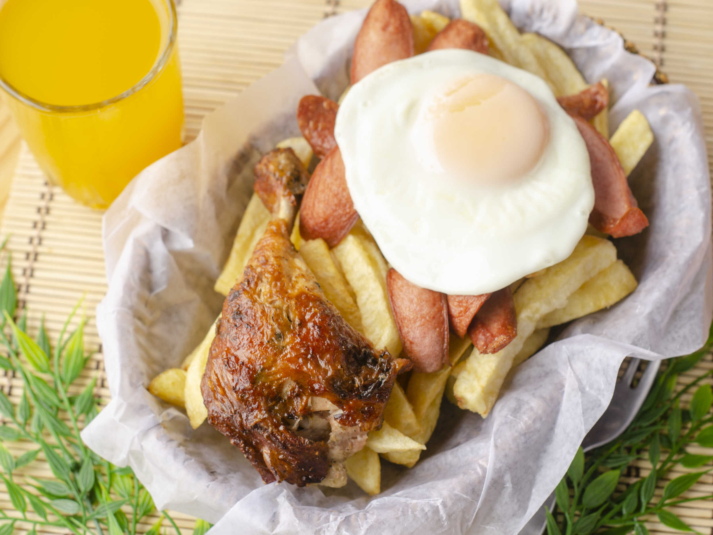 1/4 Pollo a la brasa parte pierna, 2 palitos de anticucho, 2 chorizos, 2 chuletas, mollejitas ensalada acompañada de papas fritas mas 1 Maracuyá de 1 L o Pepsi de 2 L.