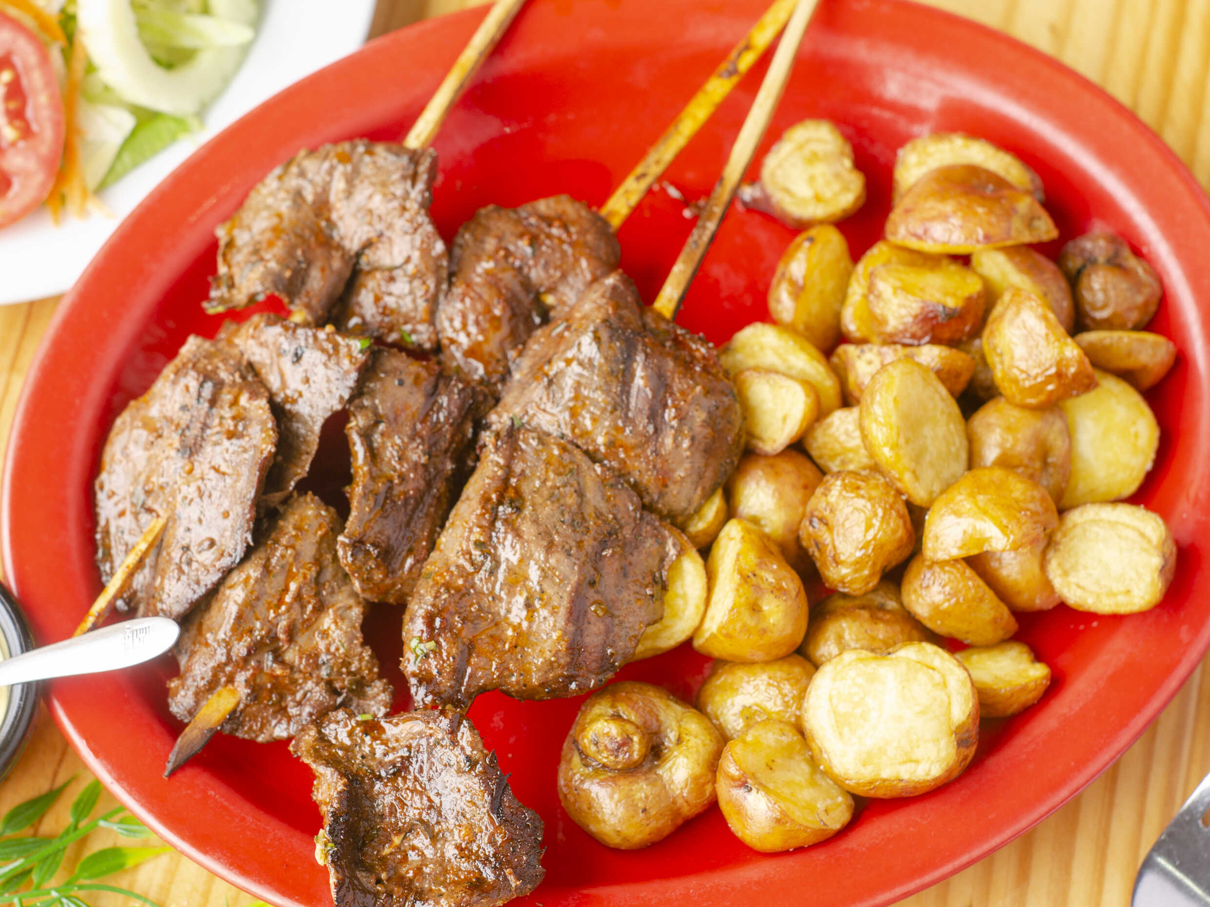 Palitos de anticucho de corazón de res, marinados en nuestra salsa anticuchera, acompañados de papas fritas y ensalada casera.