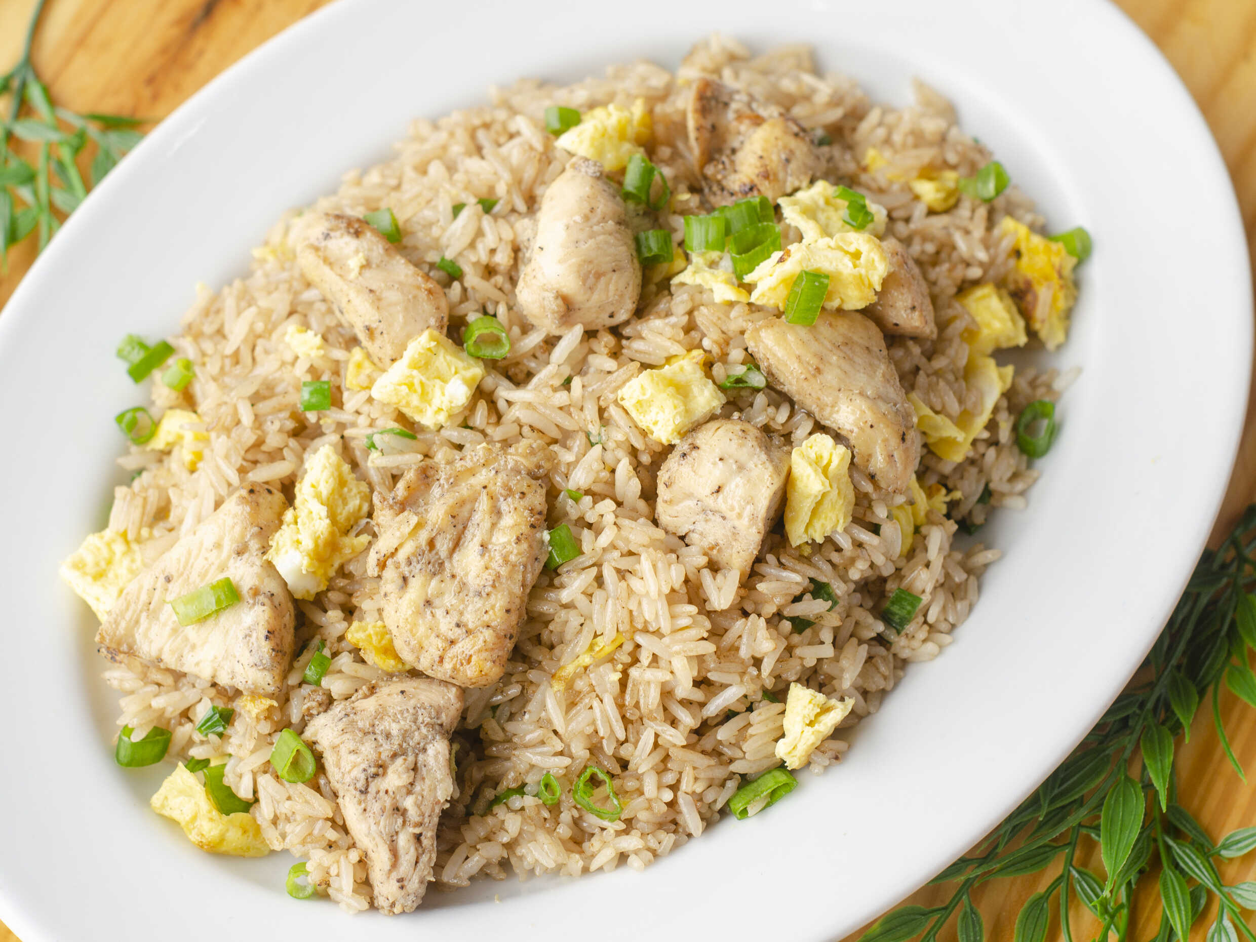 Arroz chaufa oriental con trozos de pollo.