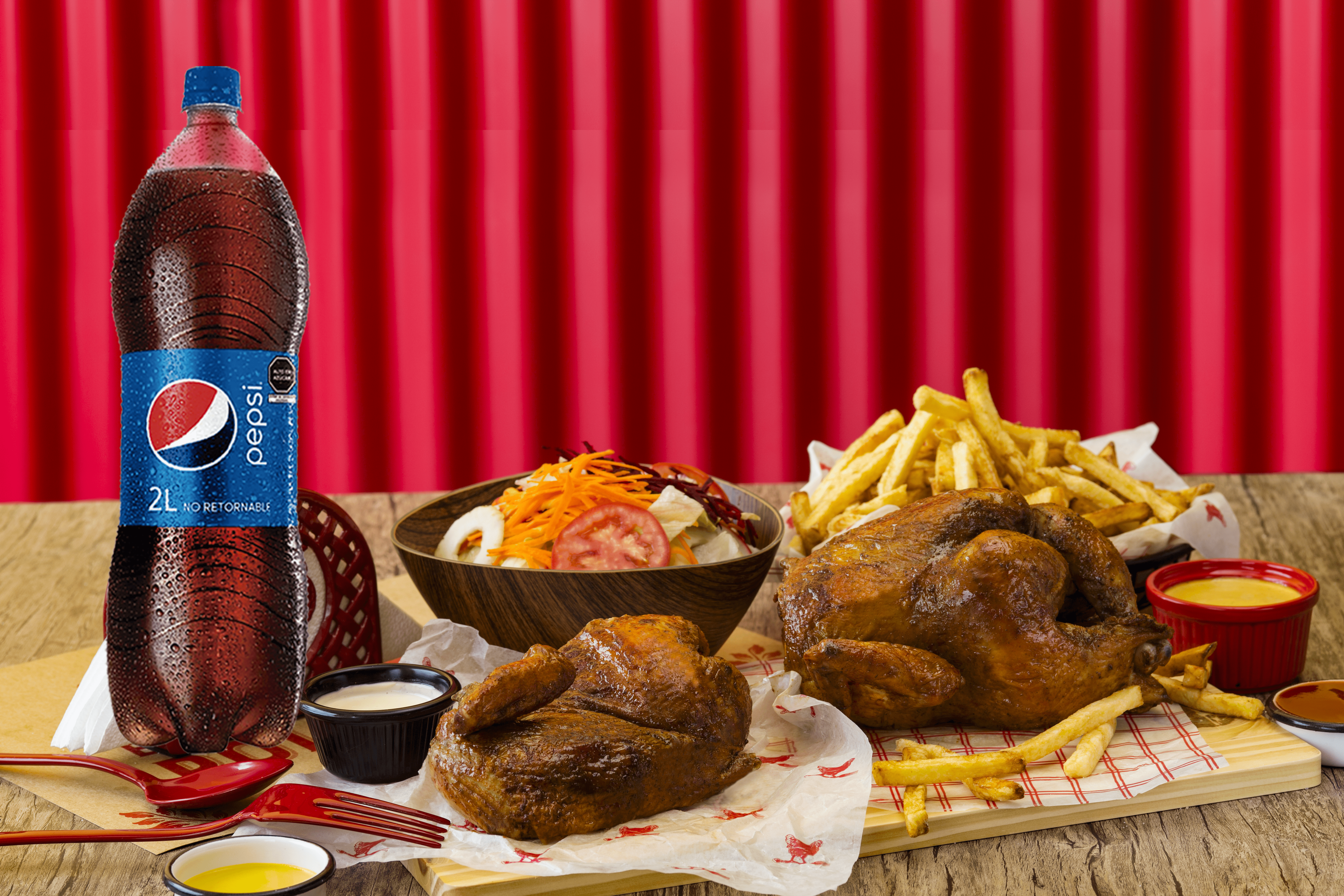 1 Pollo Excelencia más 1/2 pollo, papas fritas, ensalada, una Pepsi 2 L. y nuestras exquisitas salsas