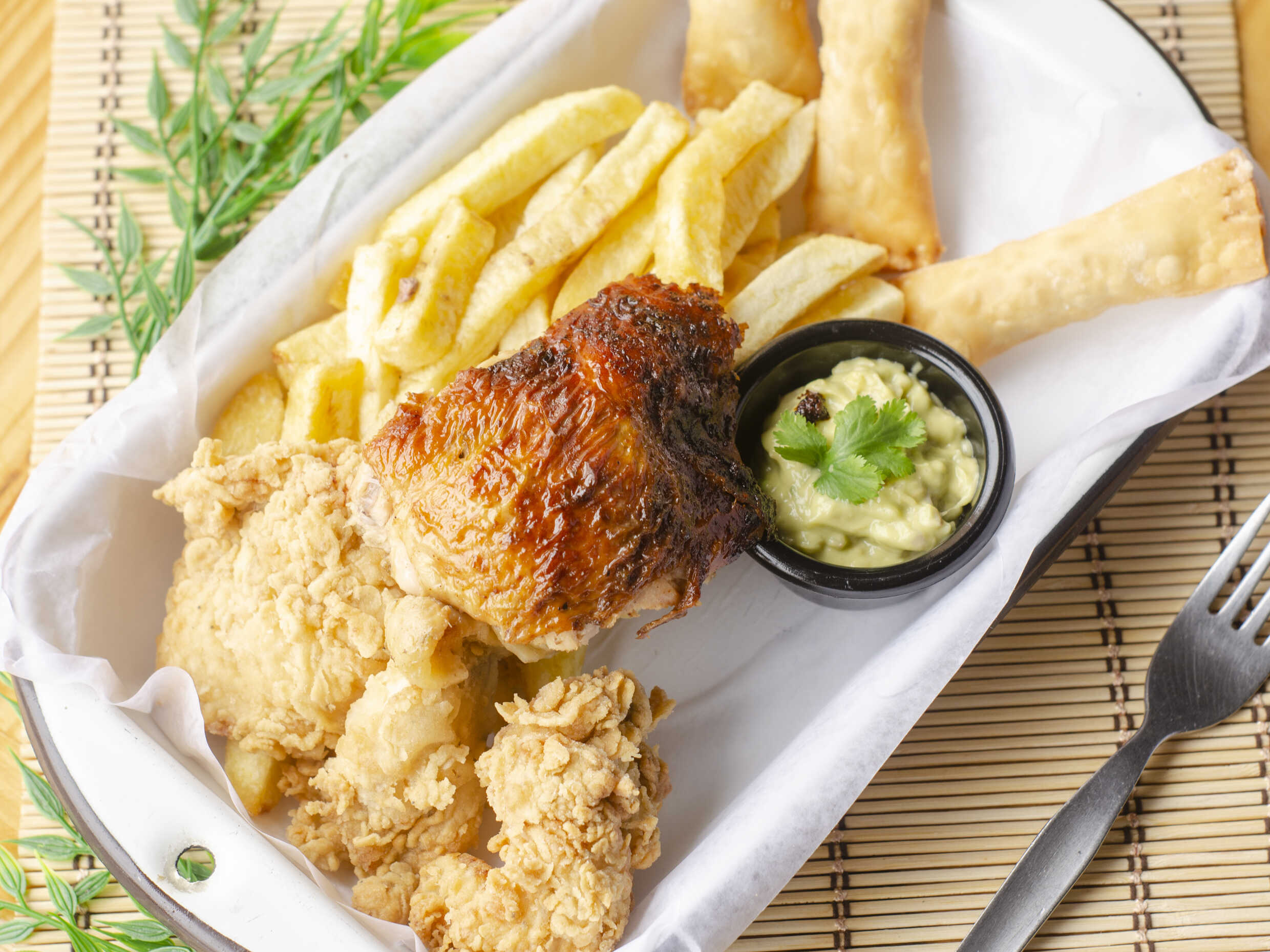 1/8 Pollo a la brasa Excelencia, 3 tequeños rellenos de pollo a la brasa con nuestra salsa guacamole y 3 chicharrones de pollo acompañados con papas fritas.