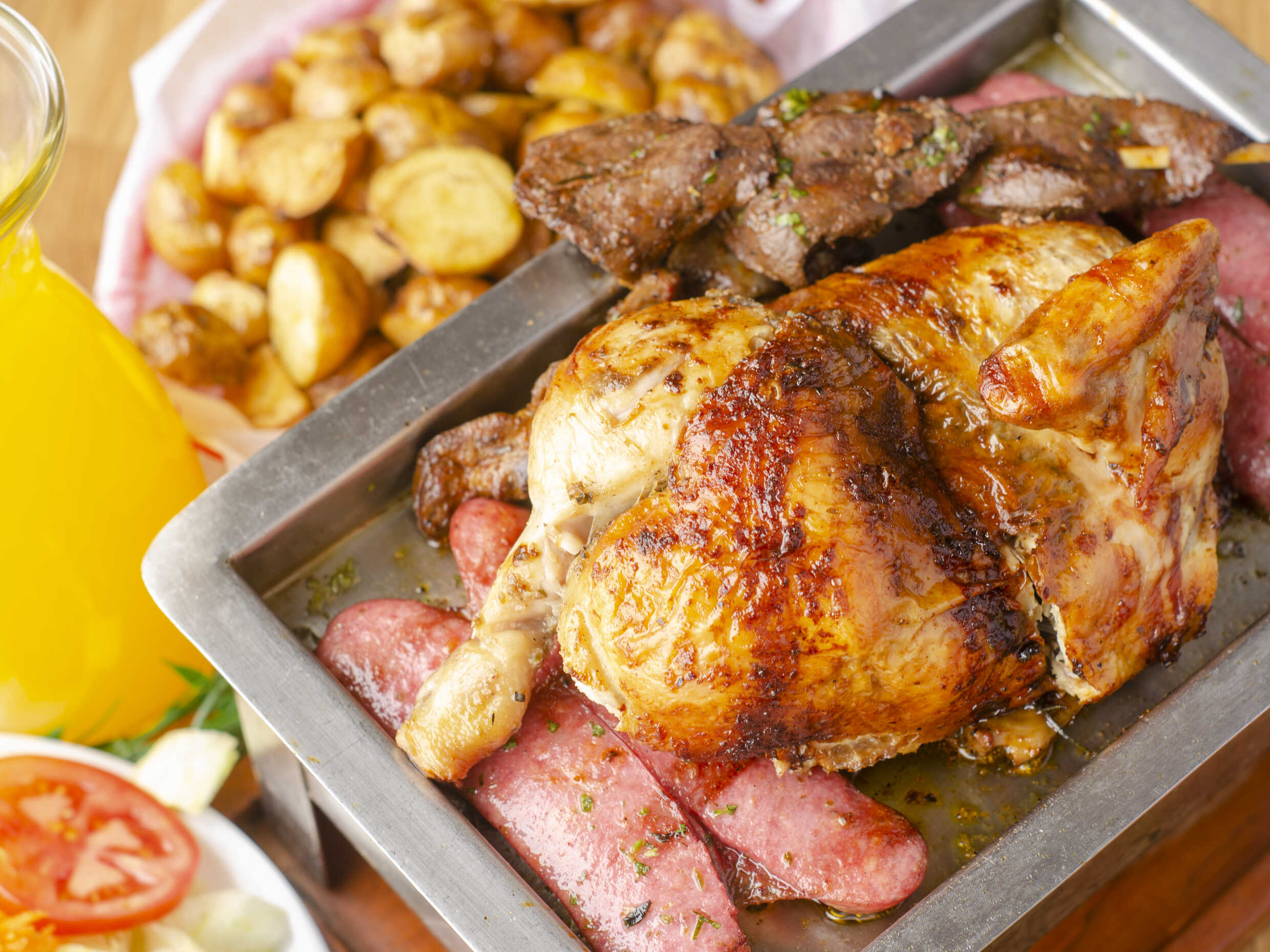 (Presa sujeta a disponibilidad) Jugoso pollo acompañado de papas fritas, ensalada y nuestras exquisitas salsas de la casa.