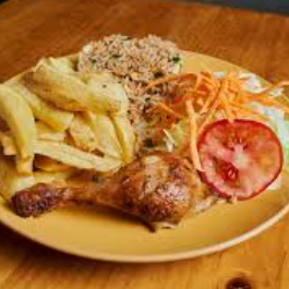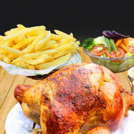 1/4 De pollo, porción de chaufa, huevo frito, plátano, abundantes papas fritas, ensalada mixta y cremas.