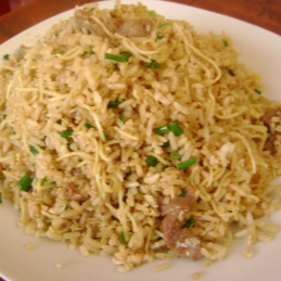 Arroz chaufa y trozos de pollo.