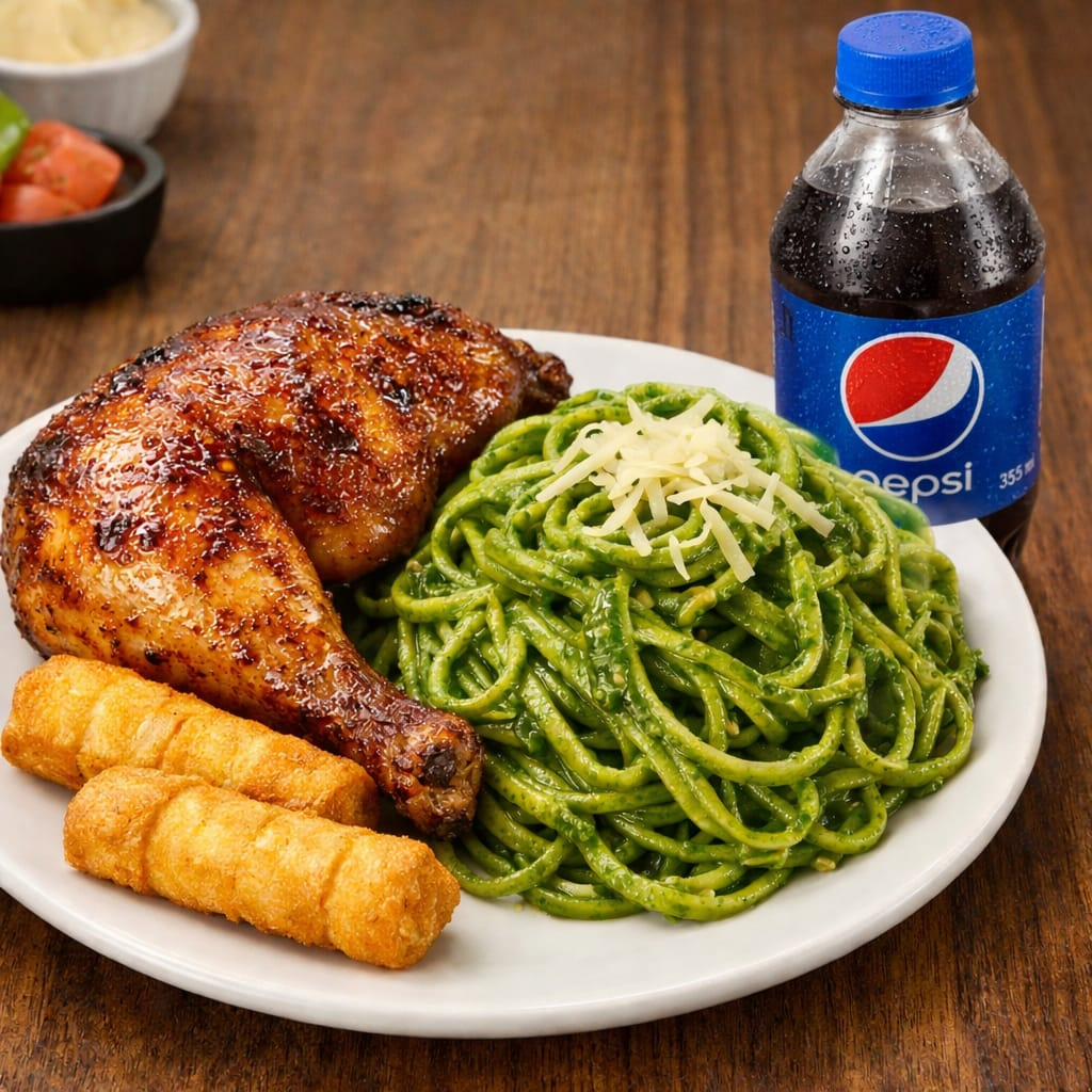 Spaghetti al pesto con 1/4 pollo, 2 tequeños de queso y gaseosa pepsi de 355 ml.
