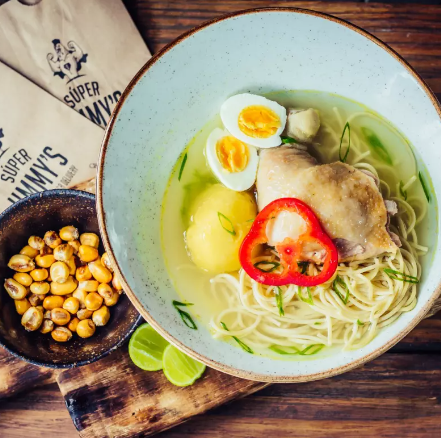 Caldo de gallina con fideo, papa amarilla, huevo cocido, presa grande, canchita, cebolla china, limón y rocoto.