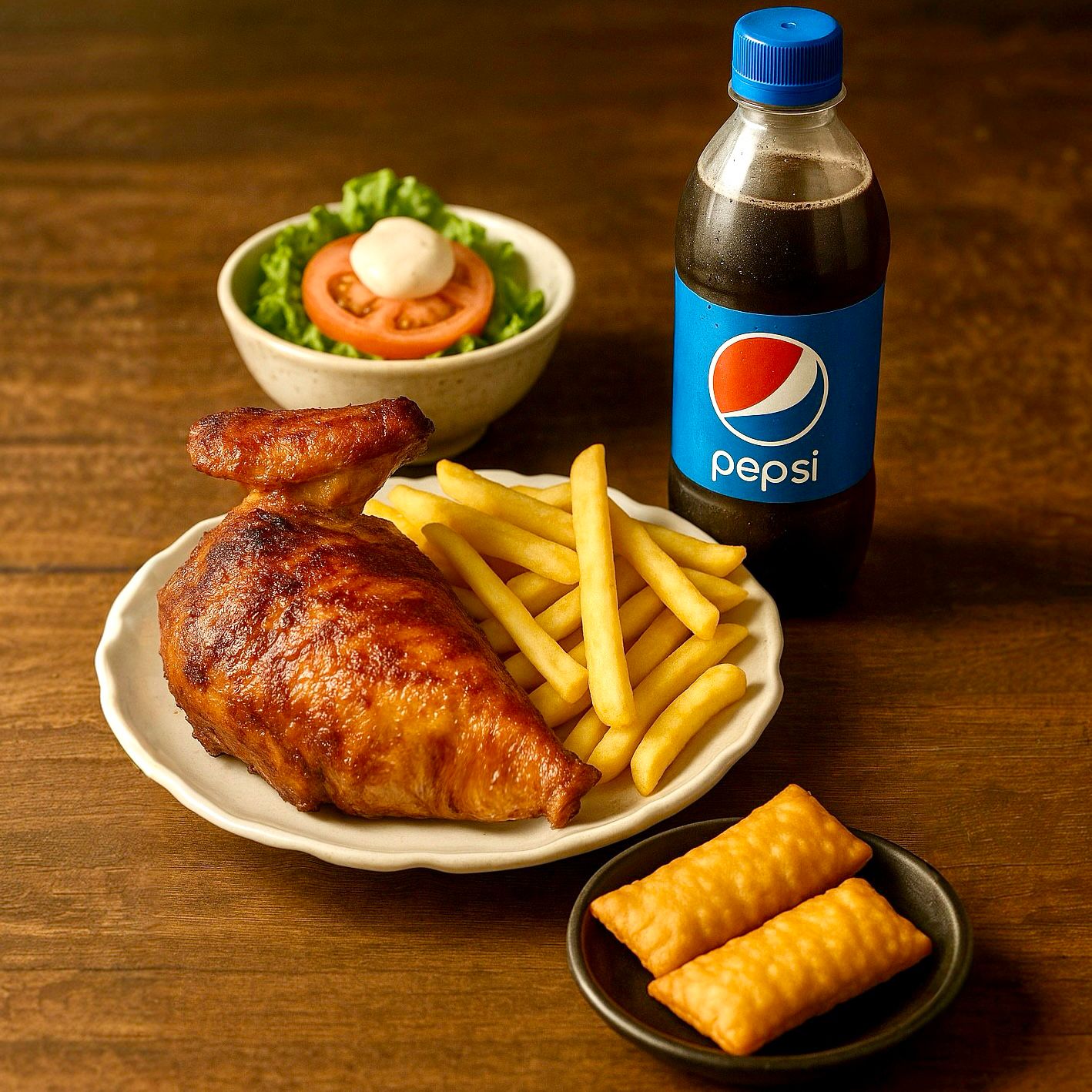 Pollo a la brasa 1/2 con ensalada de lechuga, tomate, zanahoria, pepino, vinagreta de la casa, 2 tequeños, 2 bebidas Pepsi de 355mly 3 cremas a elegir.