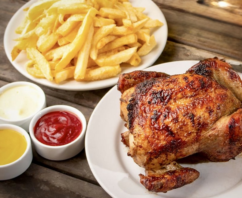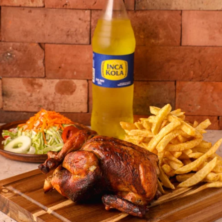 Un pollo a la brasa entero, jugoso y doradito, con papas fritas crujientes y las clásicas salsas: mayonesa y ají. ¡Perfecto para compartir y disfrutar el sabor peruano que encanta a todos!.