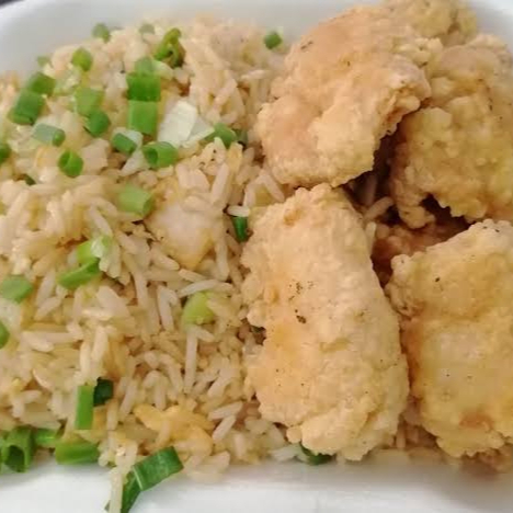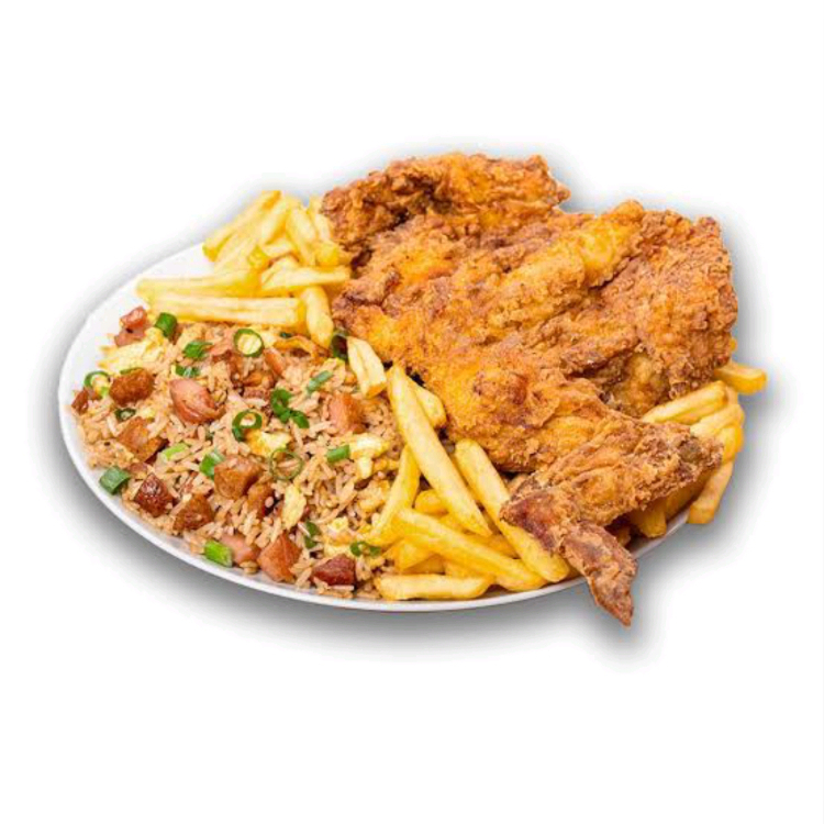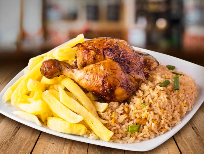 Chaufa, papas fritas y 1/8 pollo ala brasa