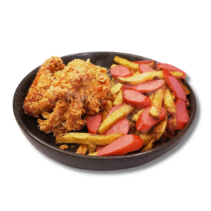 Papas fritas con hot dog+ 1/4 de pollo ala brasa + chaufa y Pepsi 355 ml