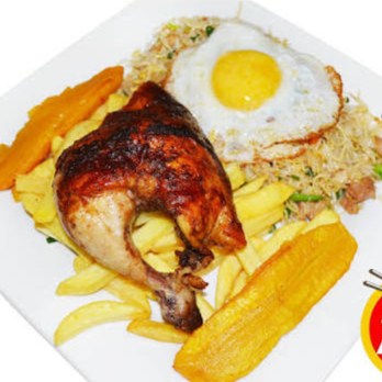 1/4 pollo + papas + chaufa + huevo+ plátano + ensalada+ cremas