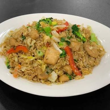Arroz frito acompañado de verduras, huevo y pollo.