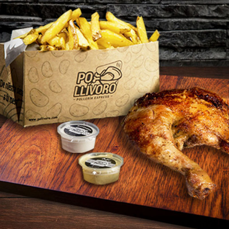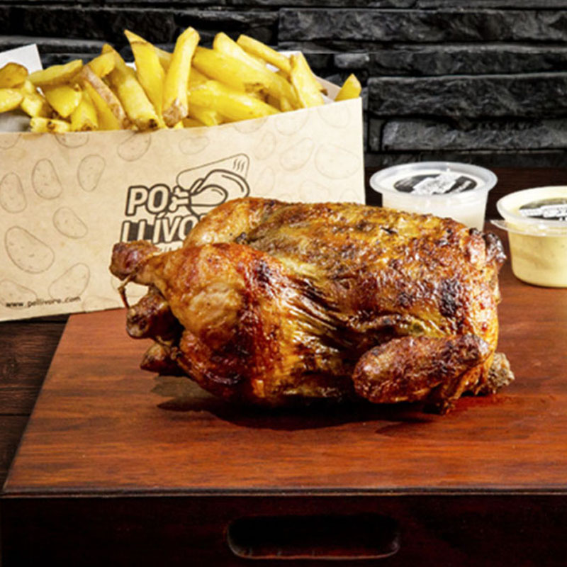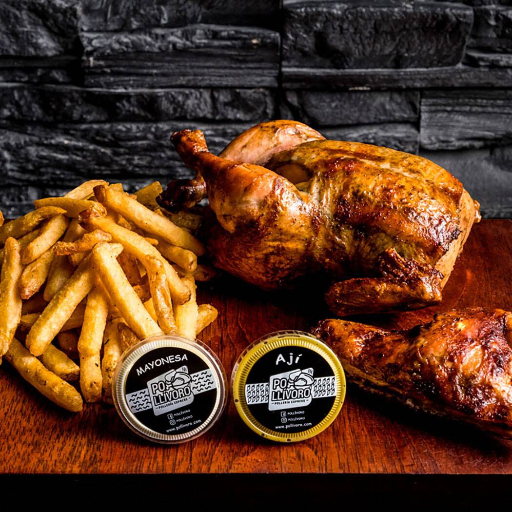 Pollo horneado en brasas, acompañado de crocantes de papas nativas fritas, cremas de la casa: ají Pollívoro (02) y mayonesa (01) y nuestra ensalada Pollívoro, con una vinagreta a base de queso parmesano y albahaca.