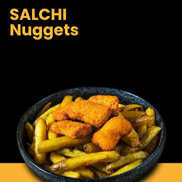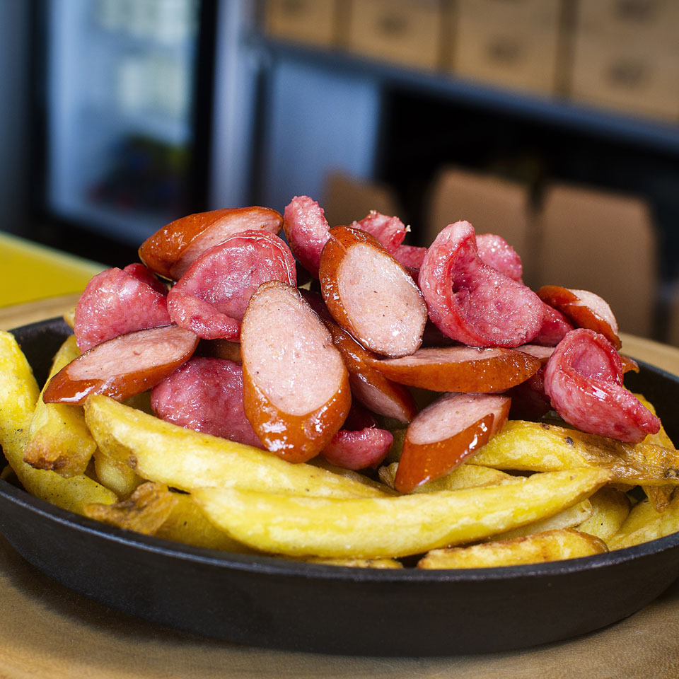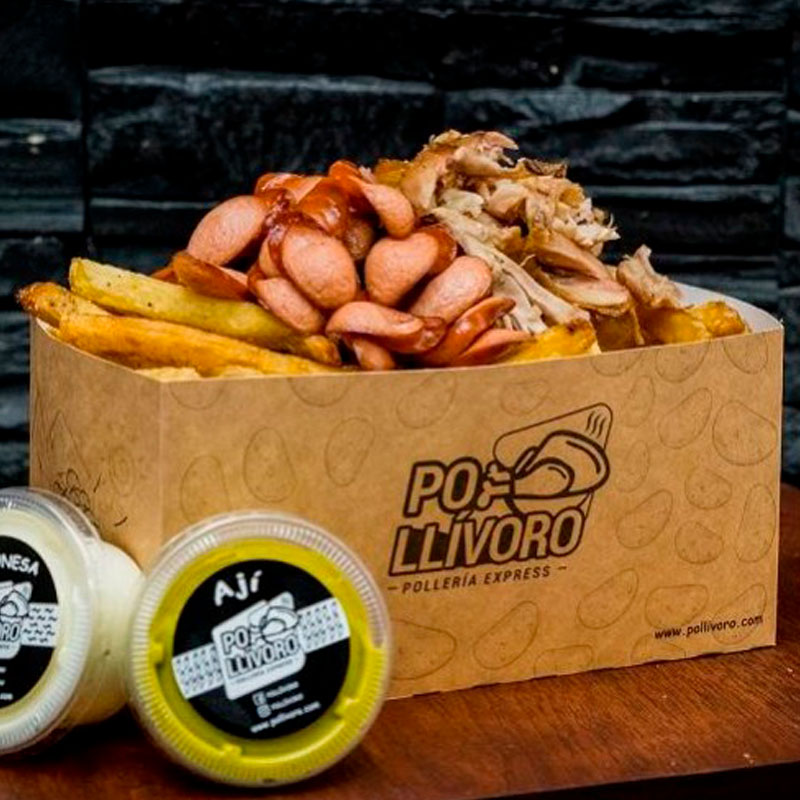 Salchicha Frankfurter ahumada, pollo brasa deshilachado y crocantes papas fritas nativas.