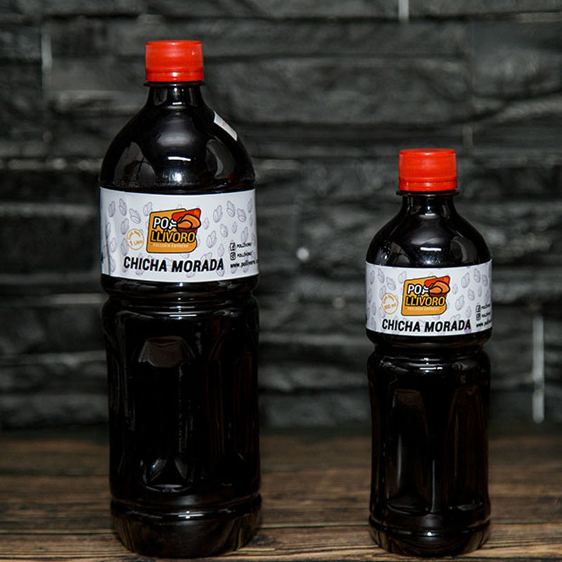 1/2 Pollo horneado en brasas, acompañado de crocantes de papas nativas fritas, cremas de la casa: ají Pollívoro (02) y mayonesa (01), acompañado de una chicha morada de 1Lt.