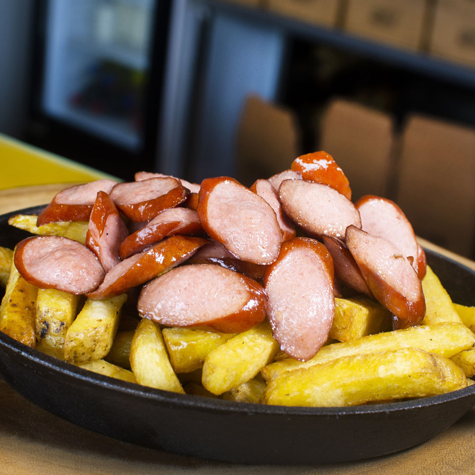 Salchicha frankfurter, chorizo precocido y crocantes papas fritas nativas