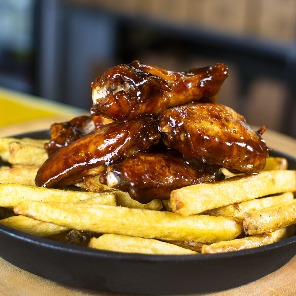 5 alitas bañadas en deliciosa salsa BBQ y acompañadas de crocantes papas fritas nativas.