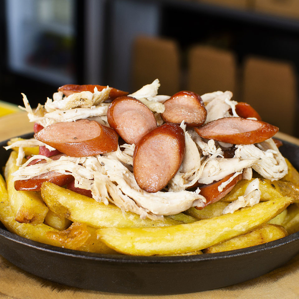 Salchicha frankfurter, pollo brasa deshilachado y crocantes papas fritas nativas.